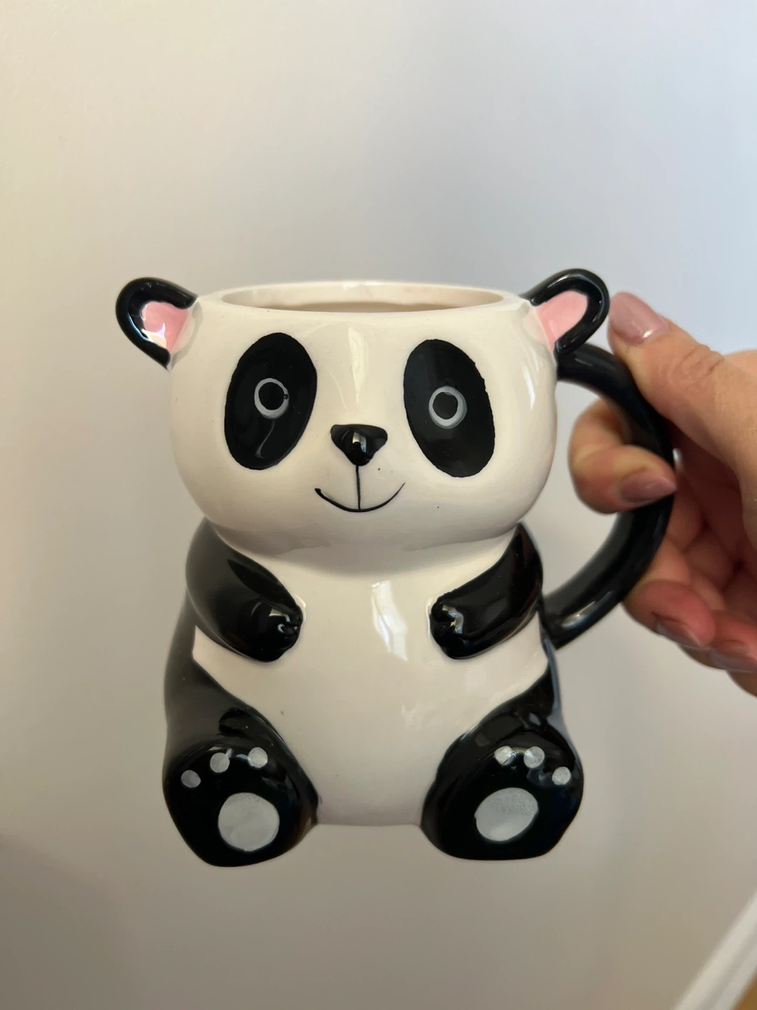 This adorable panda mug is made of ceramic. It's perfect for enjoying your morning coffee or tea! It features a playful panda design with black and white coloring and cute ears. Kids and adults alike will love this charming mug!