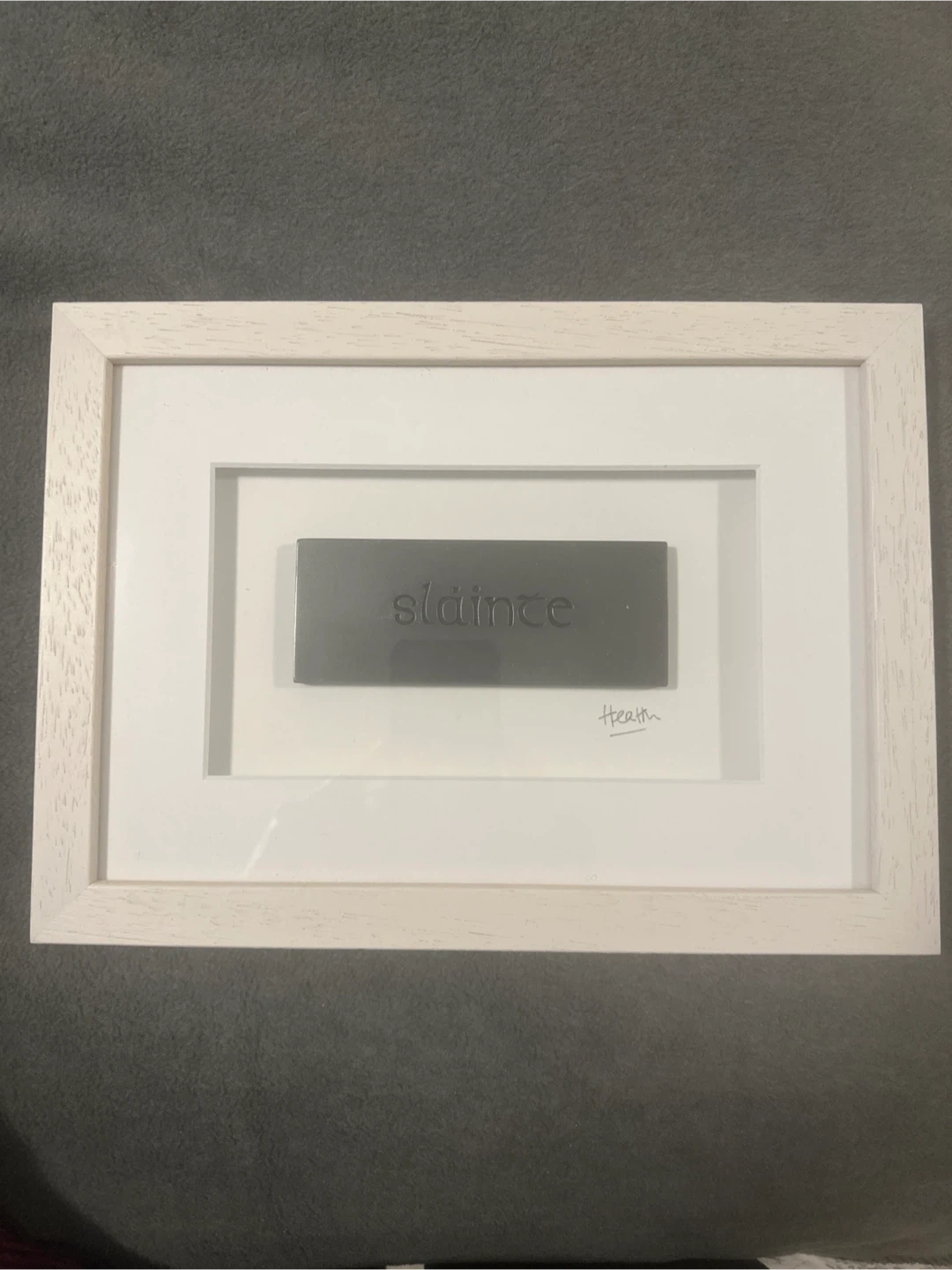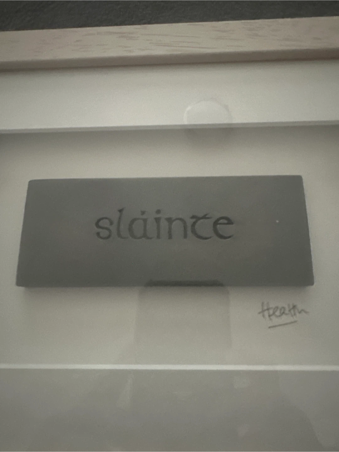 This is a framed metal sign with "Sláinte" (Irish) engraved in black. It has a sleek, dark metallic finish. Signed "Health" on the matting. Framed in dry light oak wood.