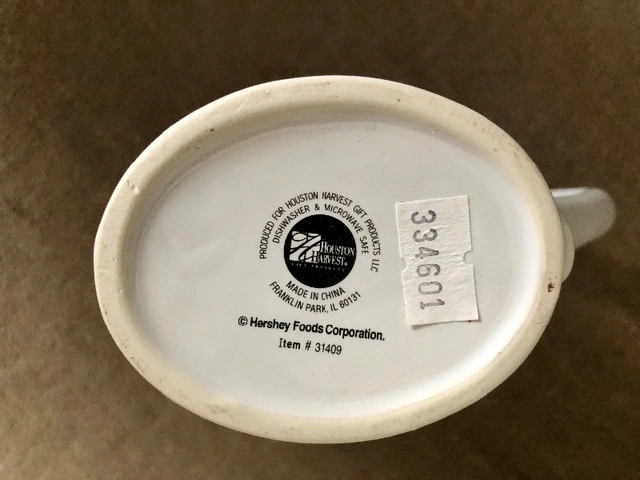Never used. Vintage 1990’s Hershey’s chocolate mug cup. "Hugs and Kisses". Unique oval shape with triangled handle. 4.5” tall, 4.25” oval top, oval base 3 1/8”. Holds 13 oz. Dishwasher and microwave safe. Pickup in Brampton, near Queen and Kennedy.