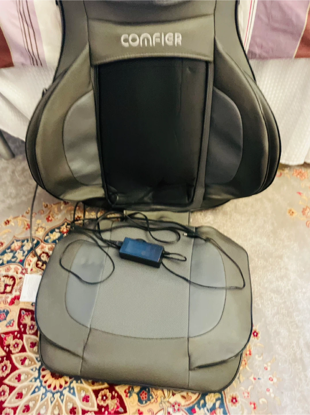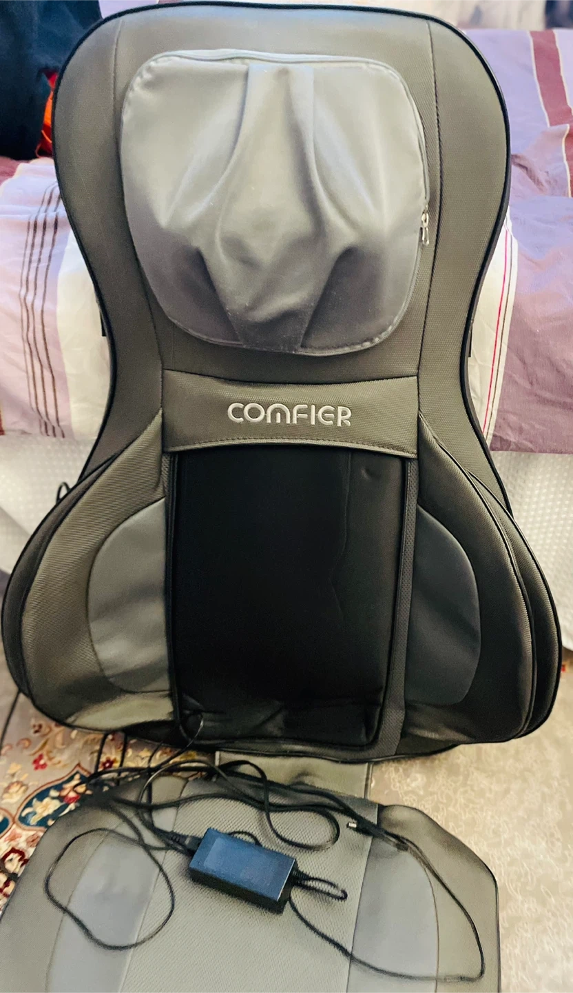 This is a Comfier brand massage seat pad. It's grey and black with a power adapter included. It offers a shiatsu massage experience.