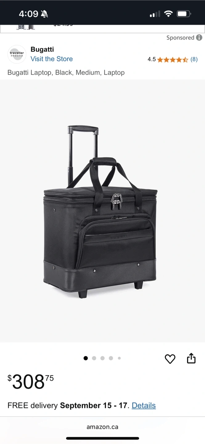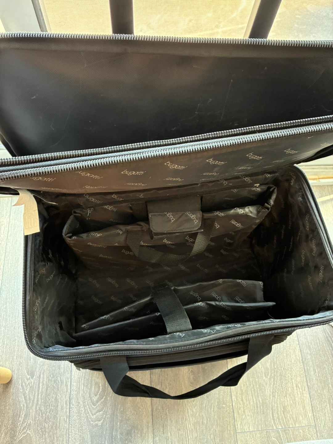 Selling a Bugatti laptop bag in black. It's in great shape, just has some scratches on the metal part on the back. This rolling bag is perfect for travel or commuting. It retails for around $300.