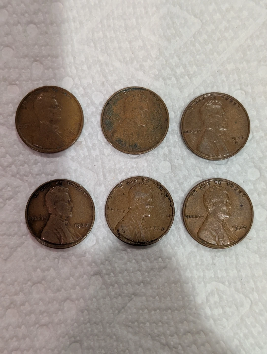 Selling six Lincoln wheat pennies. They are in used condition. Dates 1935 S San Francisco, 1936 D Denver and 1934, 1937, 1938, 1939 minted in Philadelphia. Penny is an interesting for collectors, composition Bronze and is in excellent condition.