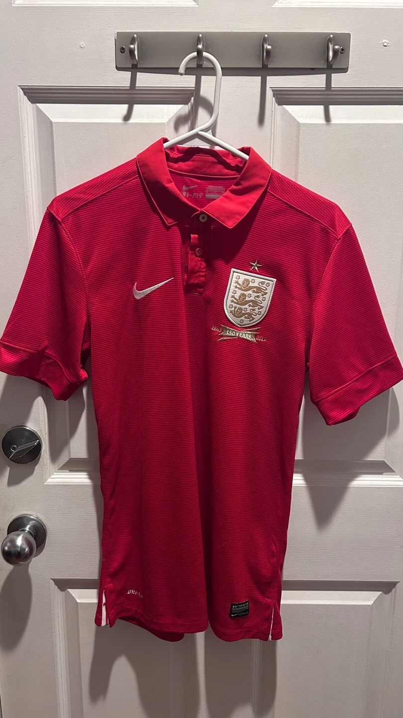 This red Nike Dri-FIT polo shirt celebrates 150 years of England football, marked with '1863 150 YEARS 2015'. It features the classic England crest and Nike swoosh. Polyester material for active wear.