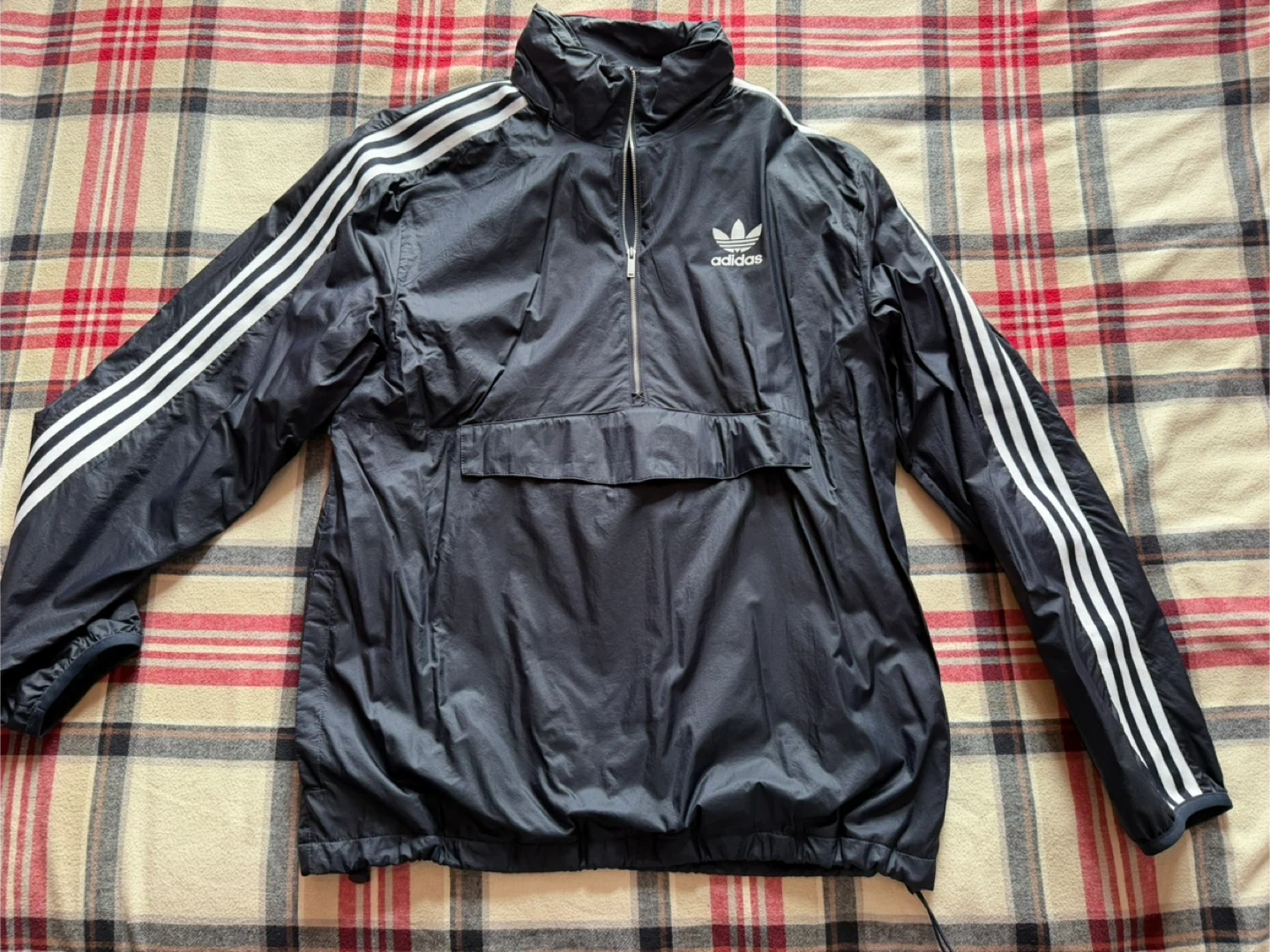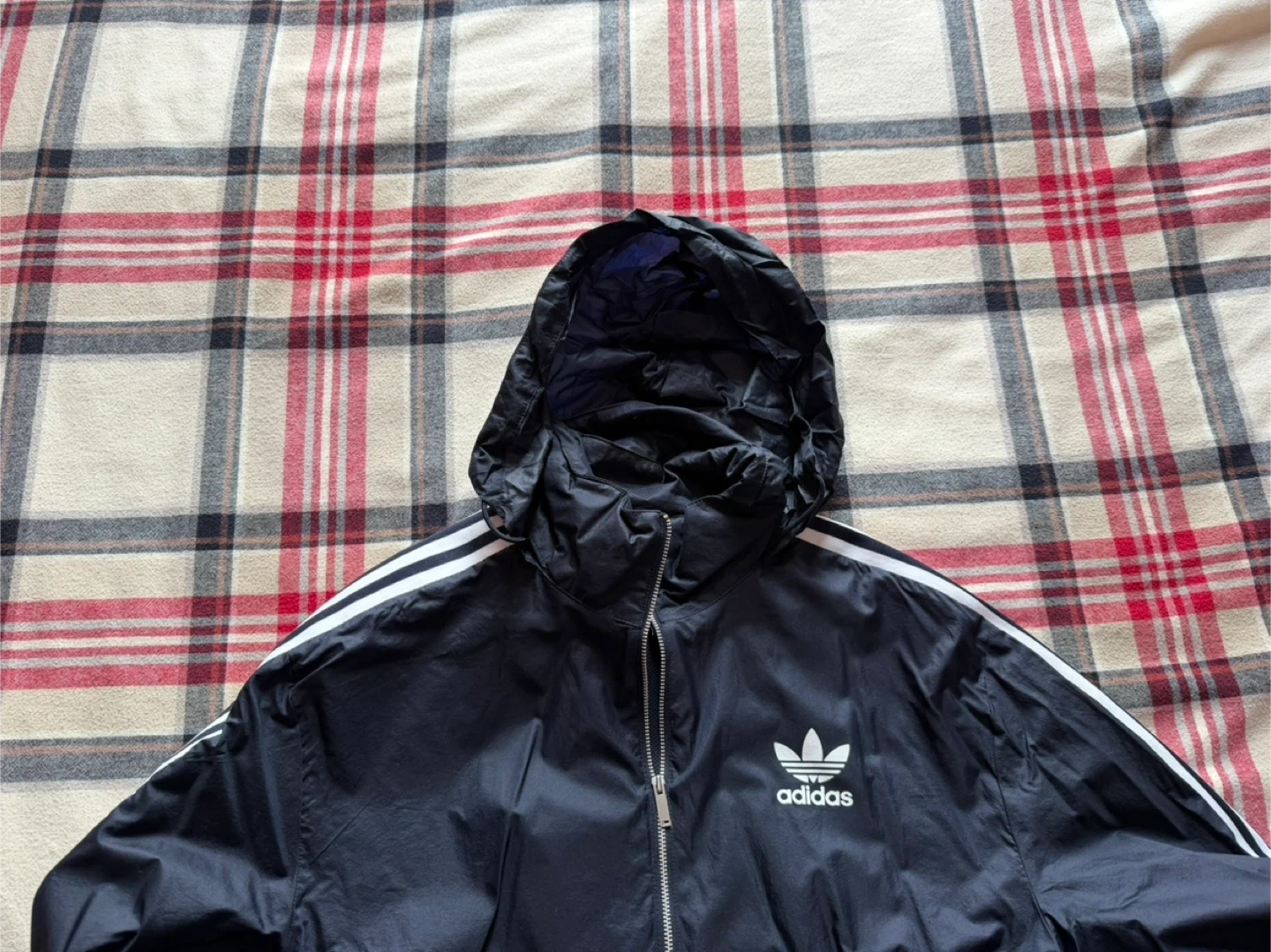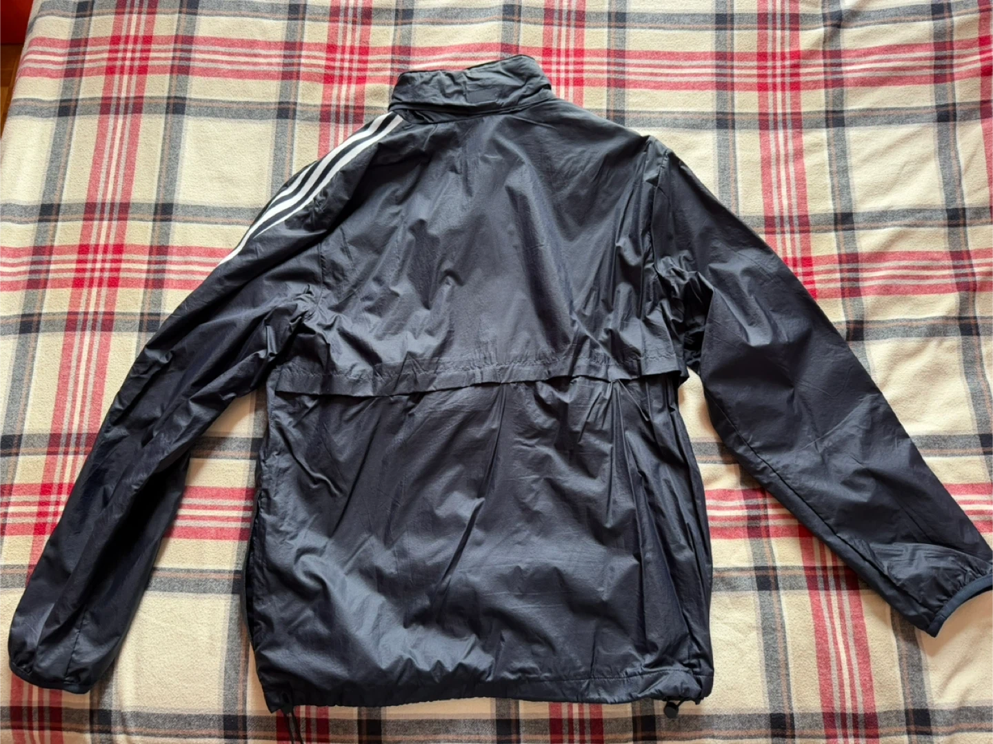 This is a navy blue Adidas windbreaker jacket with the classic three stripes. It features a hood and a zippered front pocket in addition to two side pockets. It's made from a lightweight material.