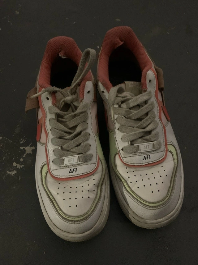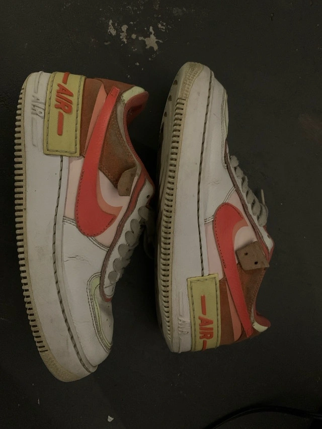 Step up your shoe game with these Nike Air Force 1 Shadow sneakers! These unique shoes feature a layered design and vibrant colour accents that add a playful twist to the classic Air Force 1 silhouette, perfect for making a statement, but also show signs of wear.
