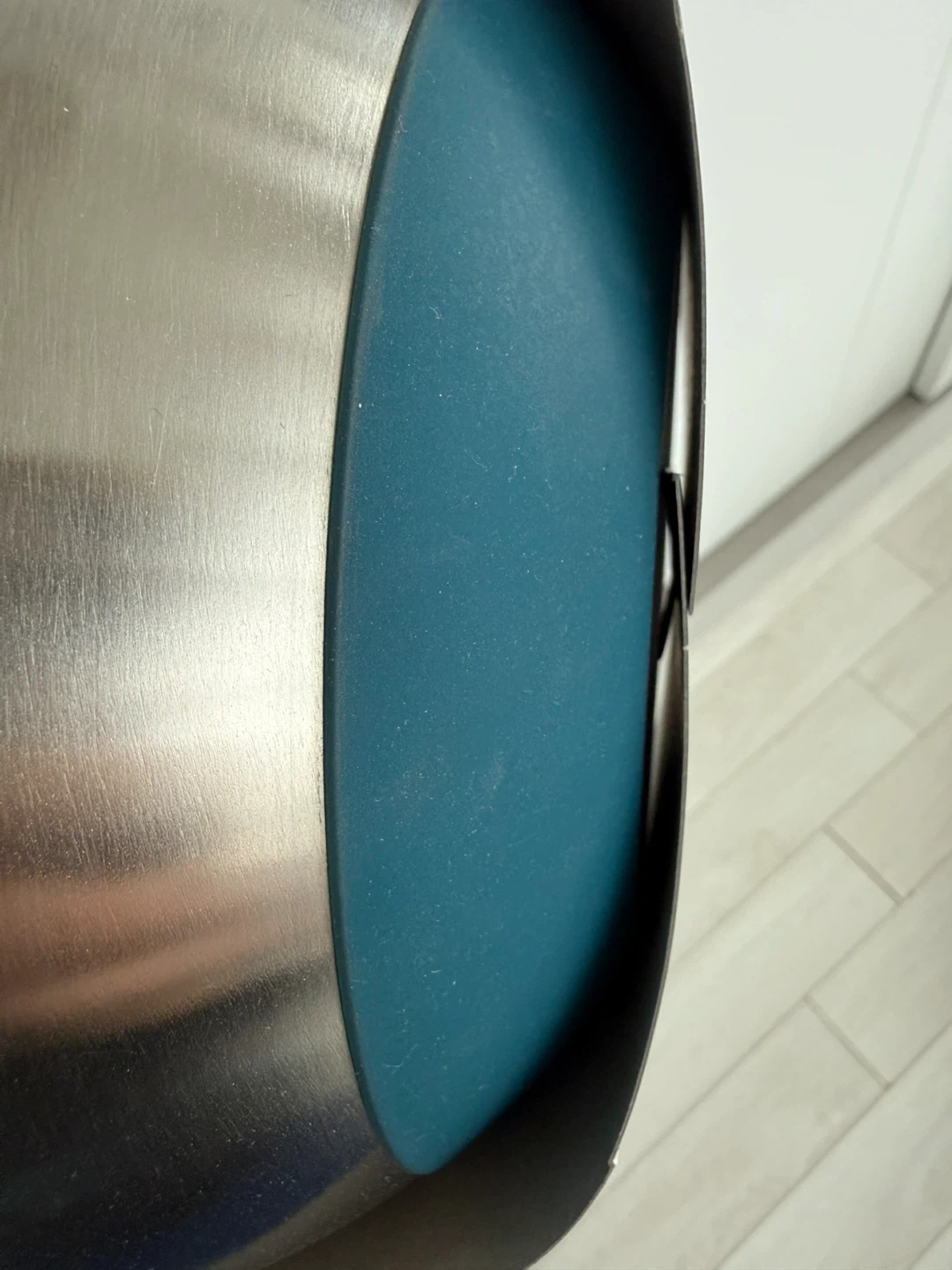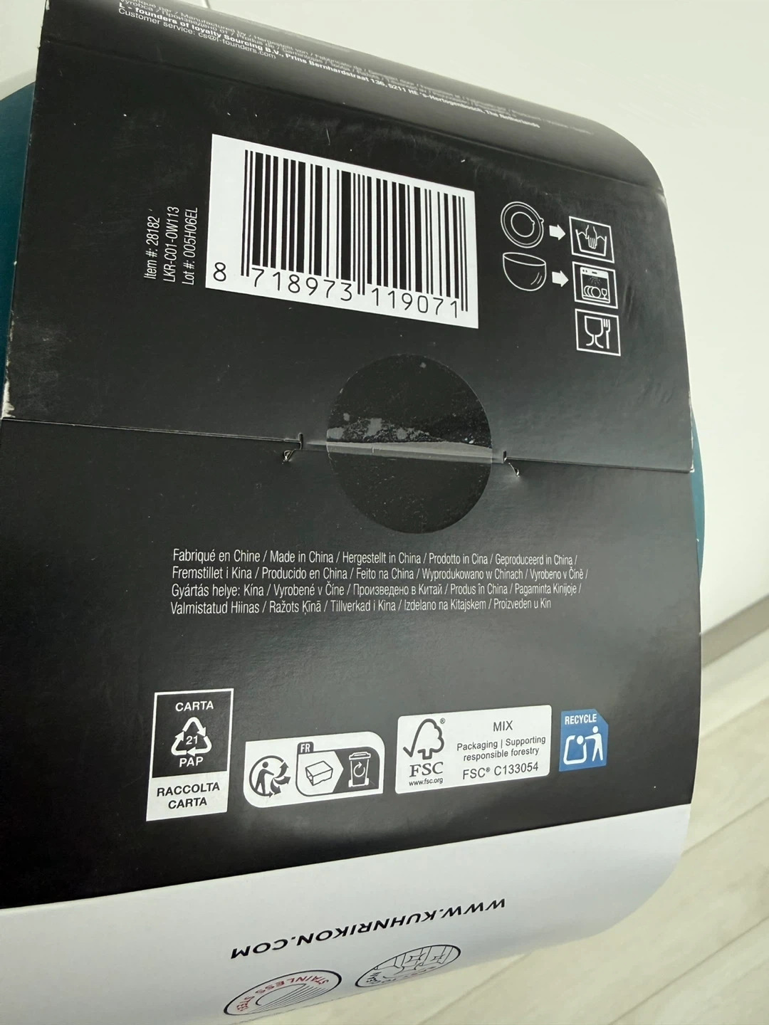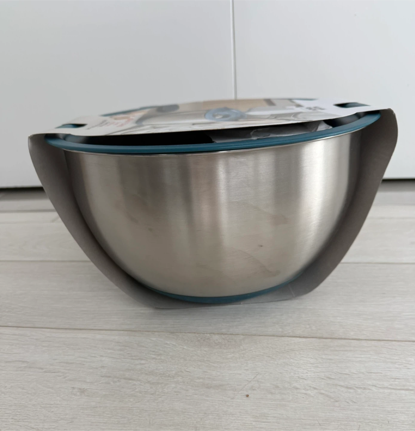 This is a Kuhn Rikon Swiss design saladier mixing bowl with a 9.4 inch diameter (24cm). It is brand new in the box. This bowl features a sleek stainless steel design with a blue non-slip base, perfect for any modern kitchen.