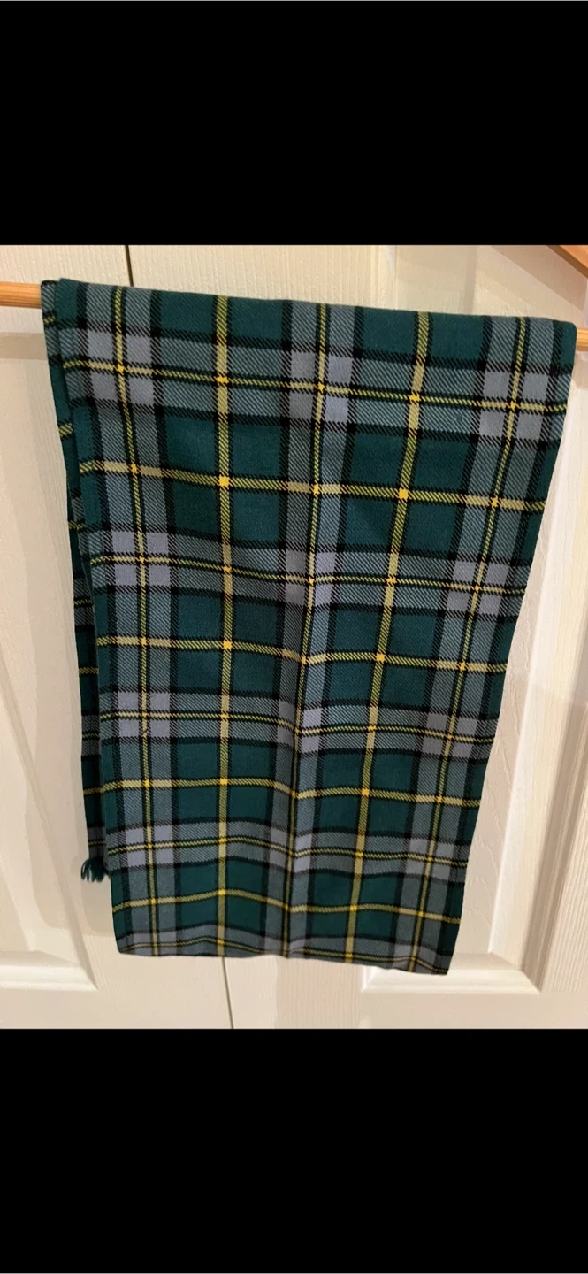 This is a plaid scarf made by Island Crafter. It's green with grey and yellow tartan. Features fringed ends. Worn once mint clean like new beautiful men’s scarf