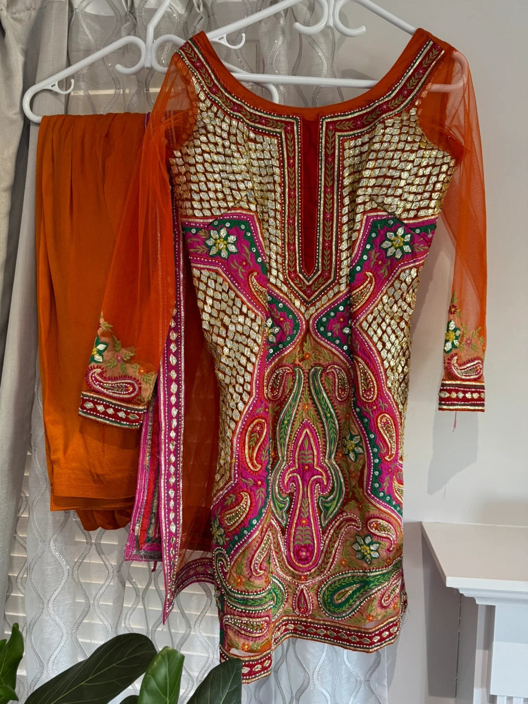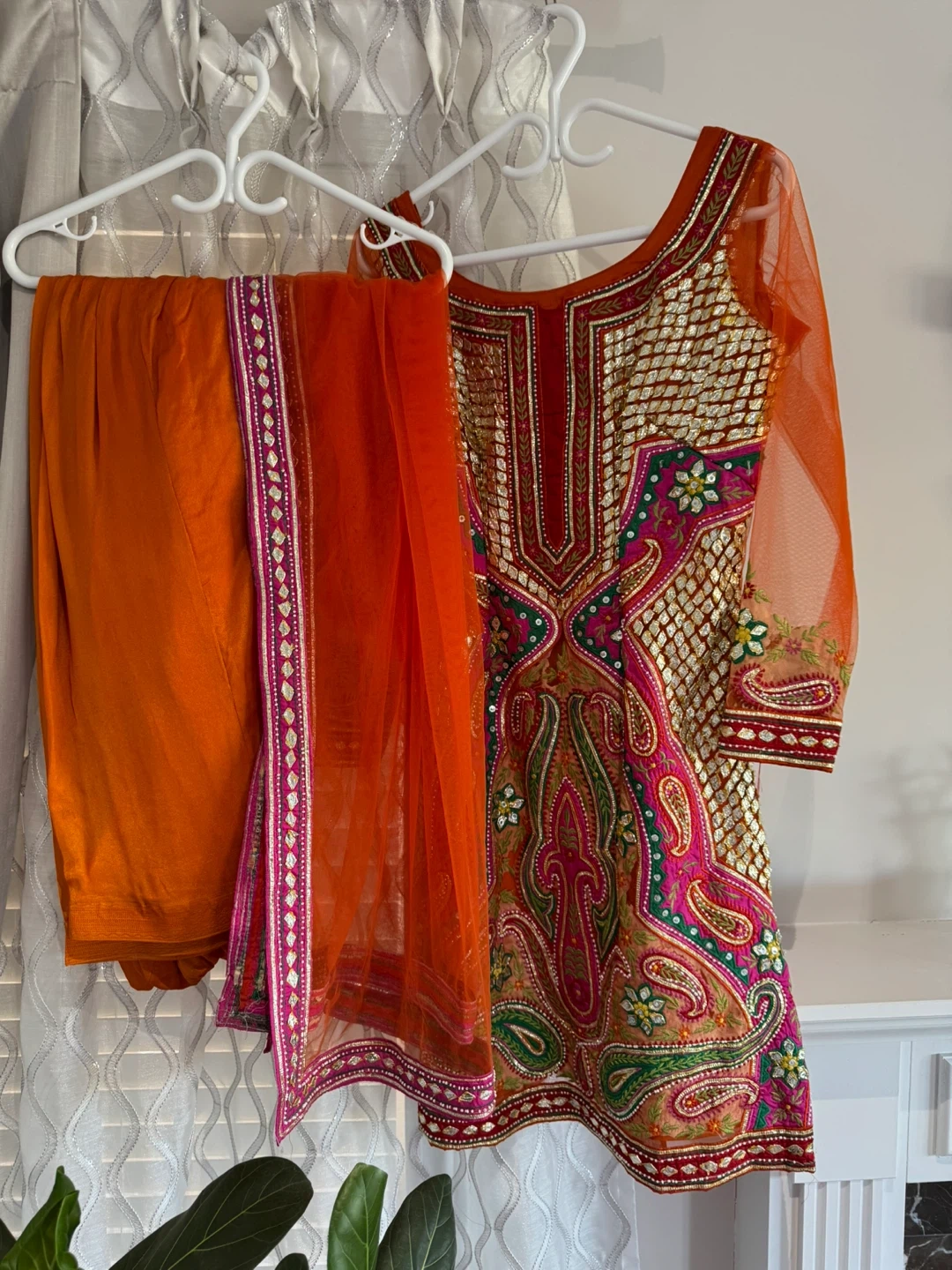 This is a vibrant orange three-piece salwar kameez set with intricate embroidery and sequin details . It features sheer net sleeves on the kameez and a coordinating orange dupatta. This outfit's detailed embellishments make it suitable for festive occasions.