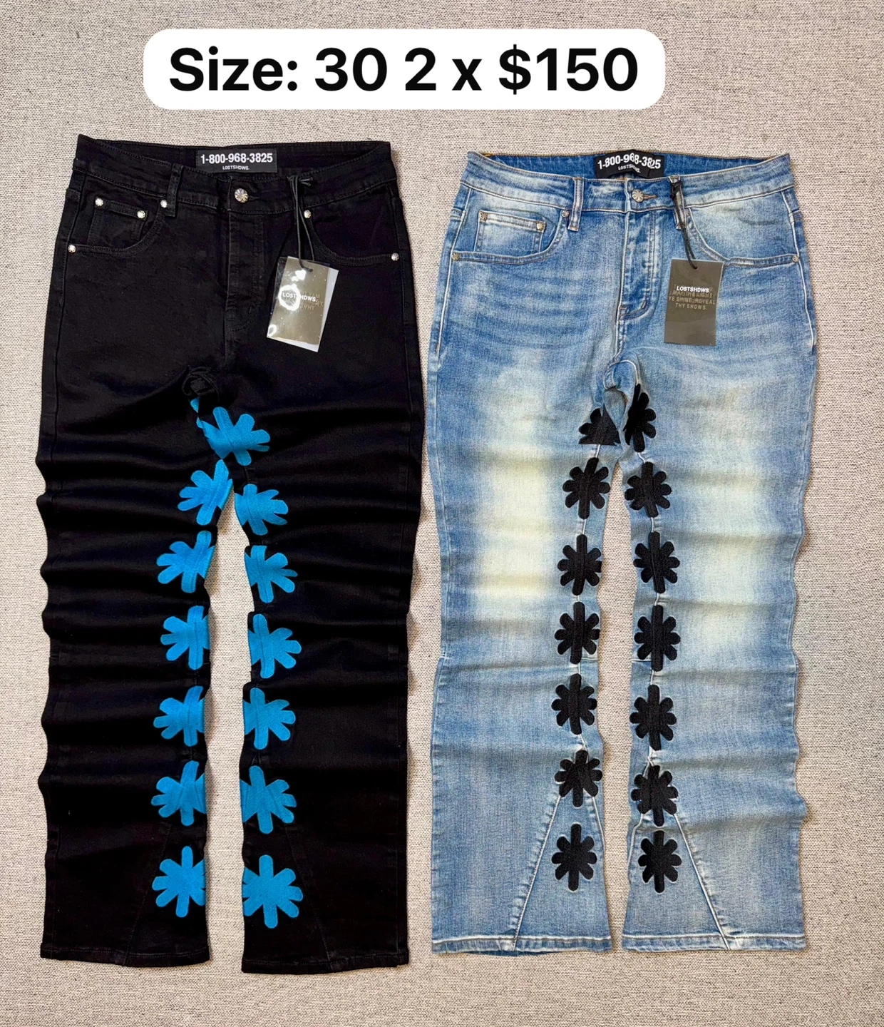 Two pairs of jeans featuring floral appliqué. One black pair with blue florals, and one light wash denim pair with black florals. Size 30.