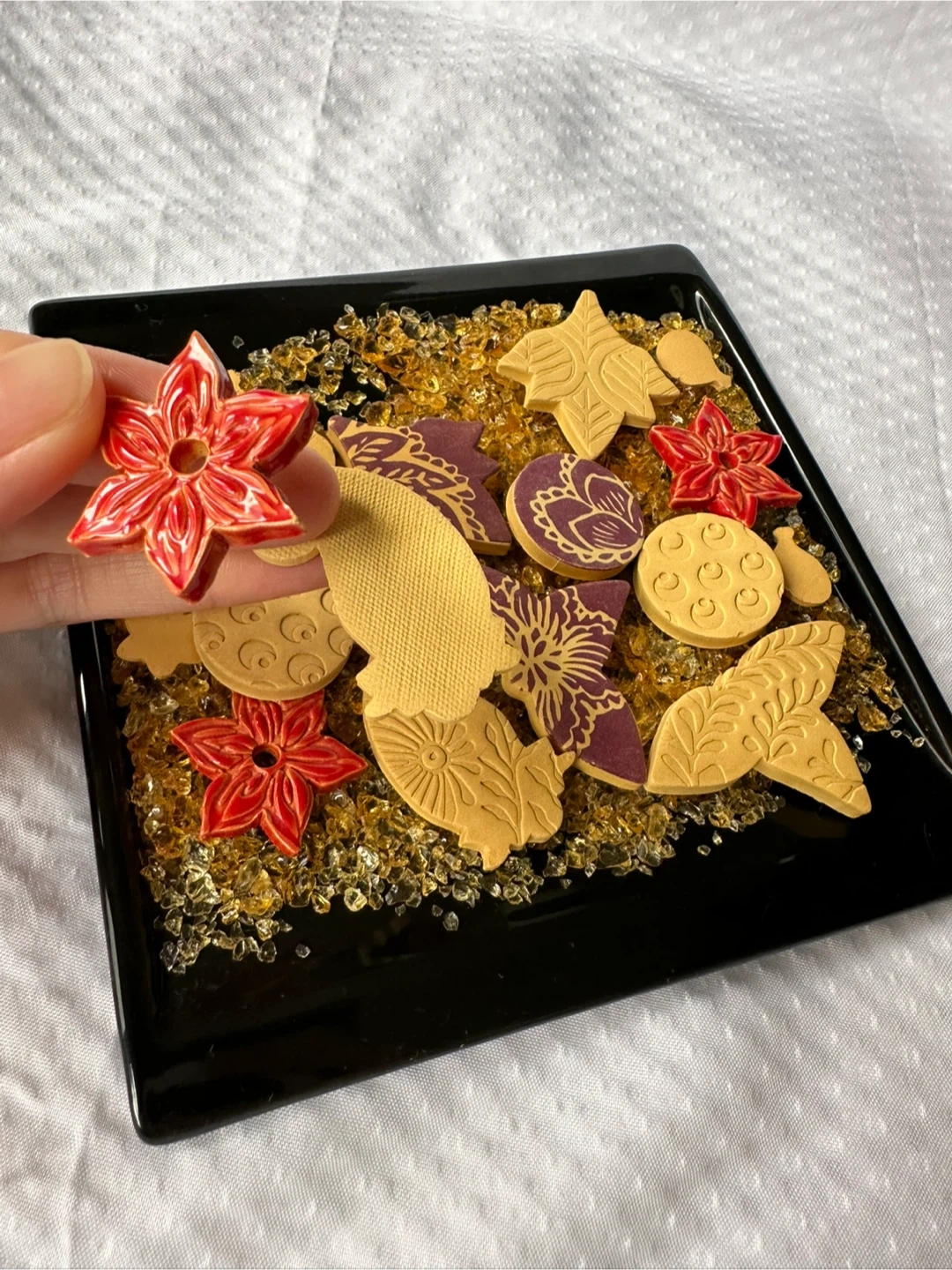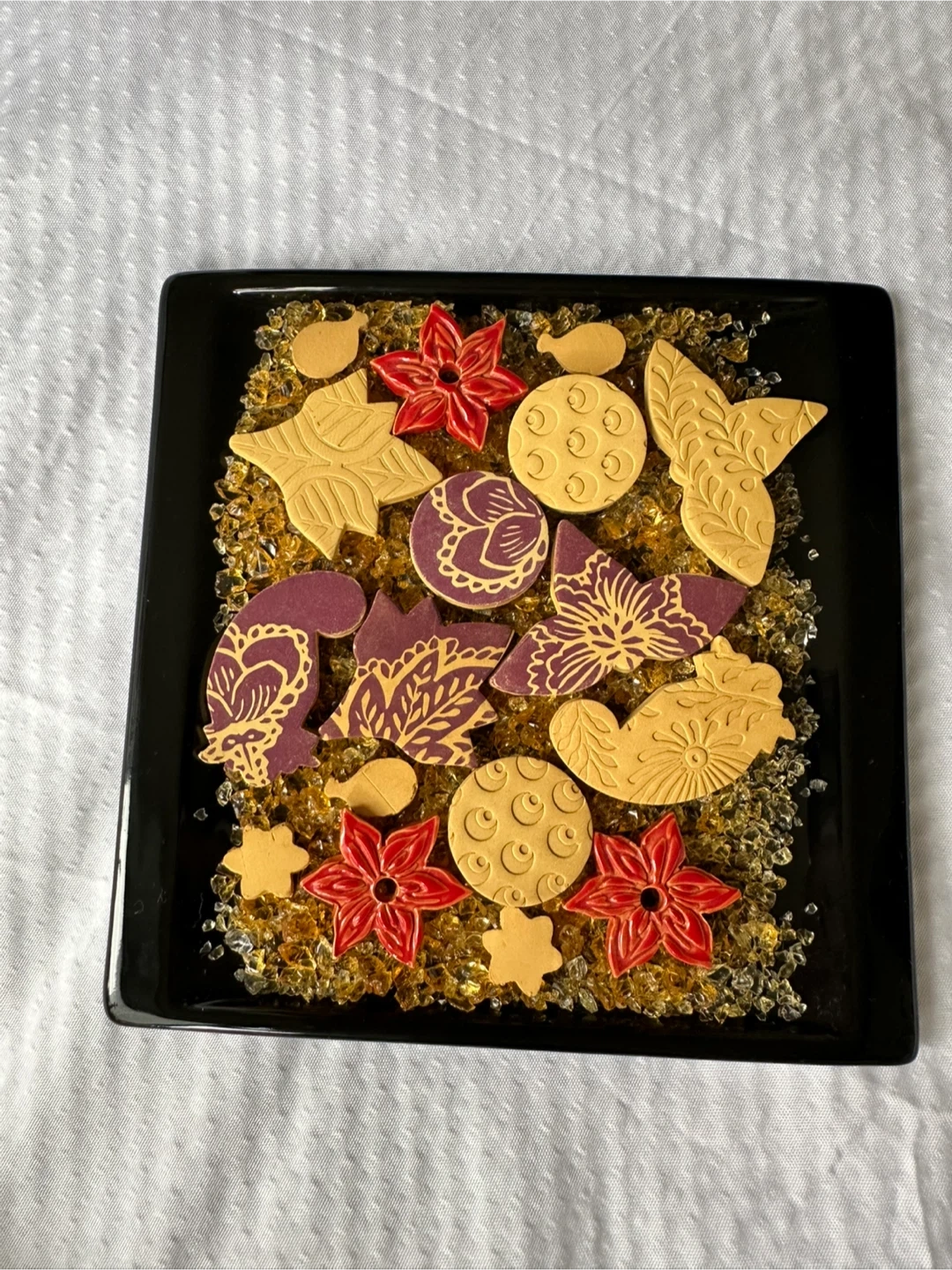 Black Ceramic Trinket Tray w/ loose glass crystals scent clay floral shapes for free arrangement.