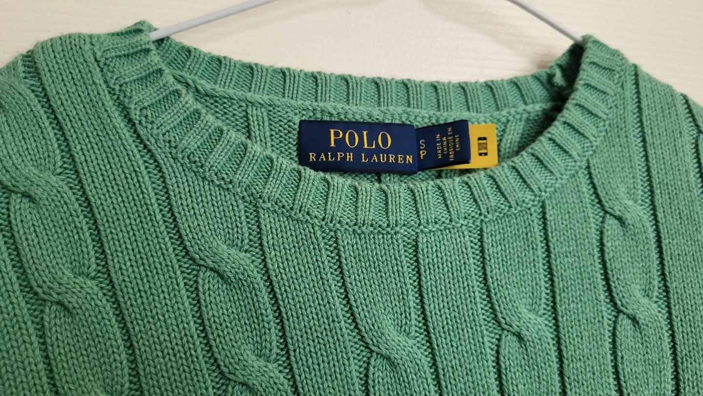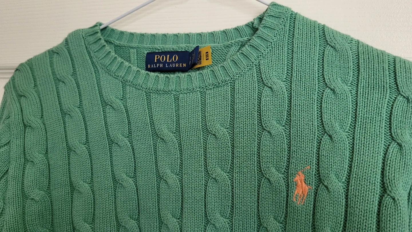 This is a green cable knit sweater from Polo Ralph Lauren (Women's). It's a size small and in great condition!