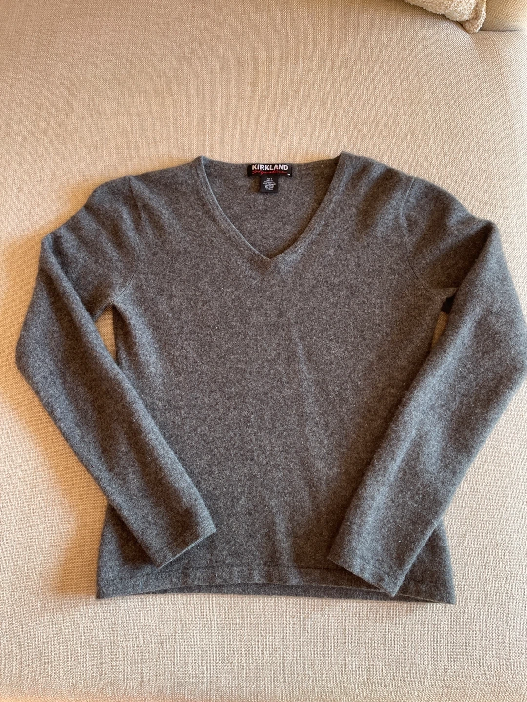 A classic grey V-neck sweater from Kirkland Signature. It's made of soft, cashmere material. This sweater is perfect for layering or wearing on its own for a casual yet put-together look.
