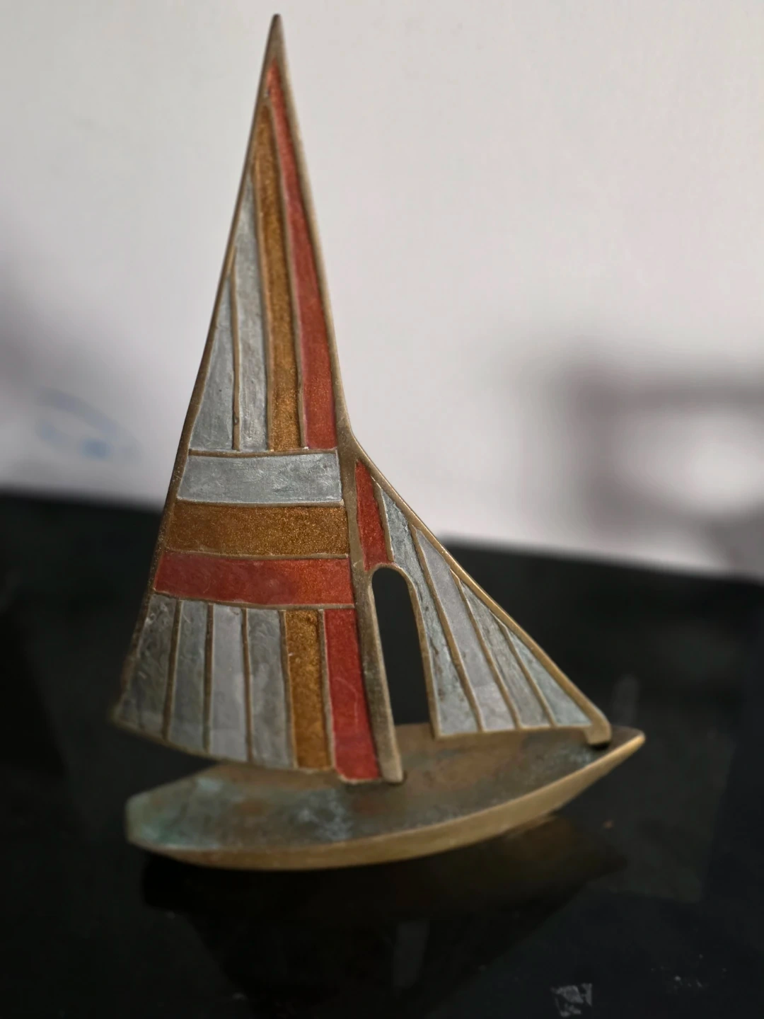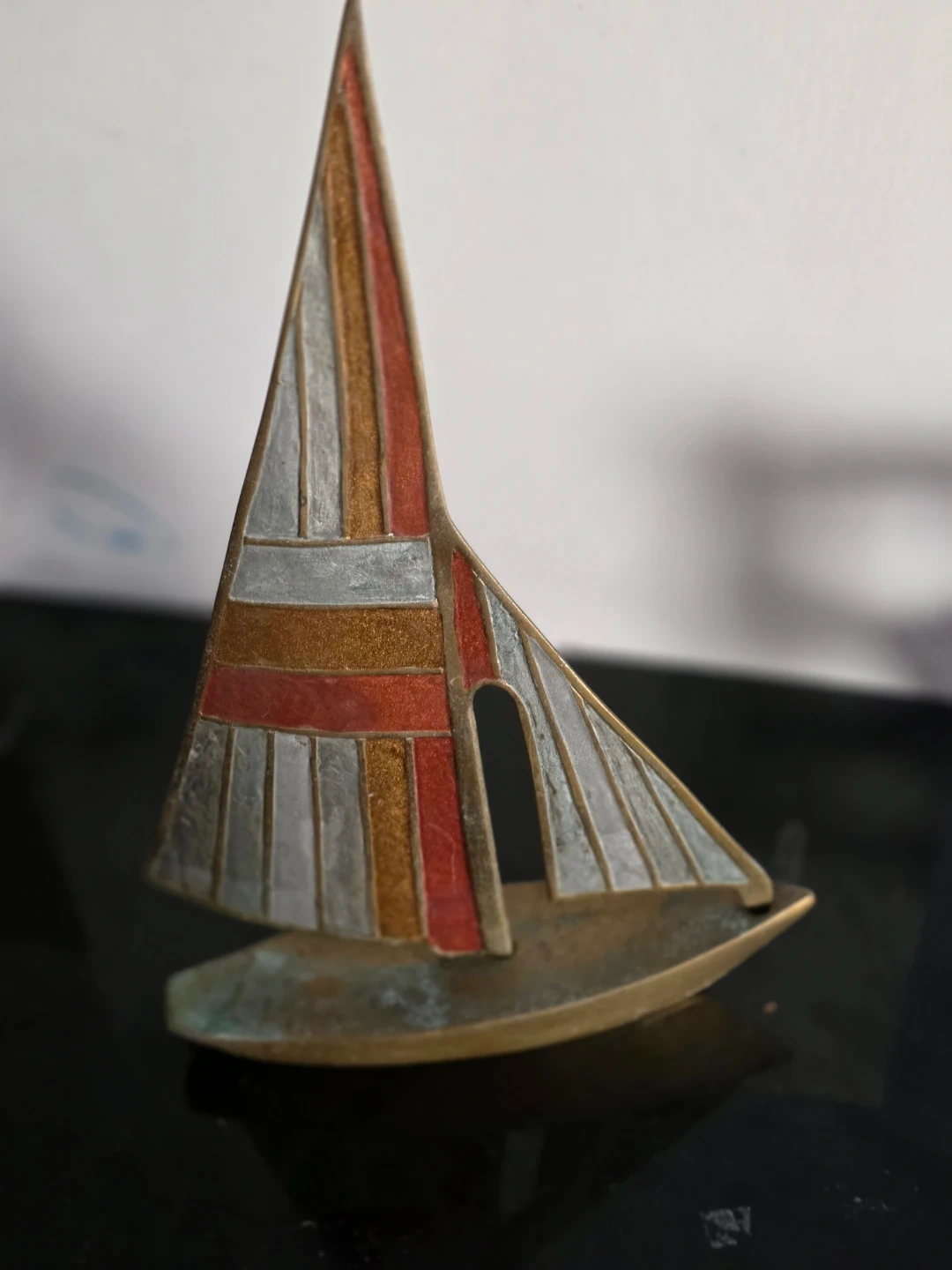 This item is a vintage Mid-Century Modern brass and enamel sailboat sculpture.
