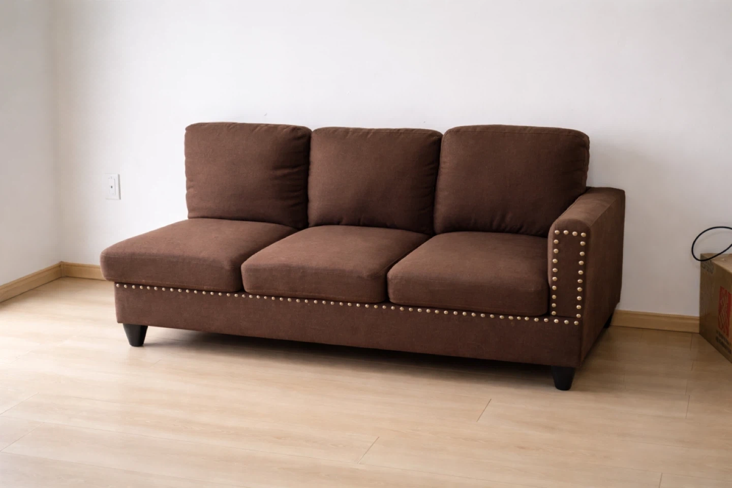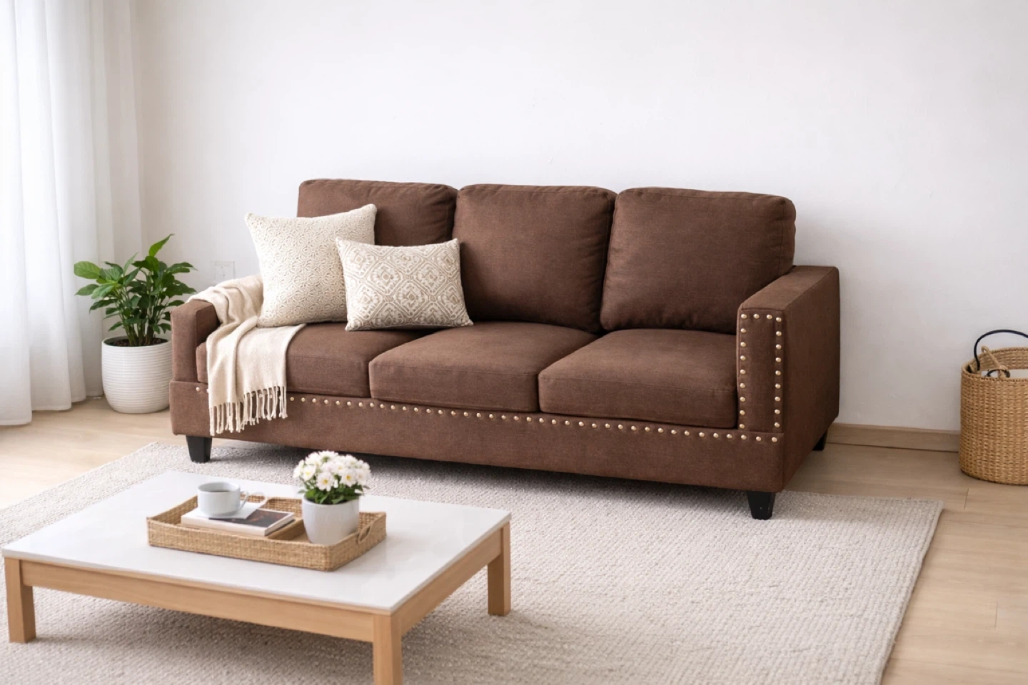 A comfortable brown three-seater sofa with decorative stud accents along the base and arms. Its upholstered fabric offers a textured look. This sofa provides ample seating for a living room or den.