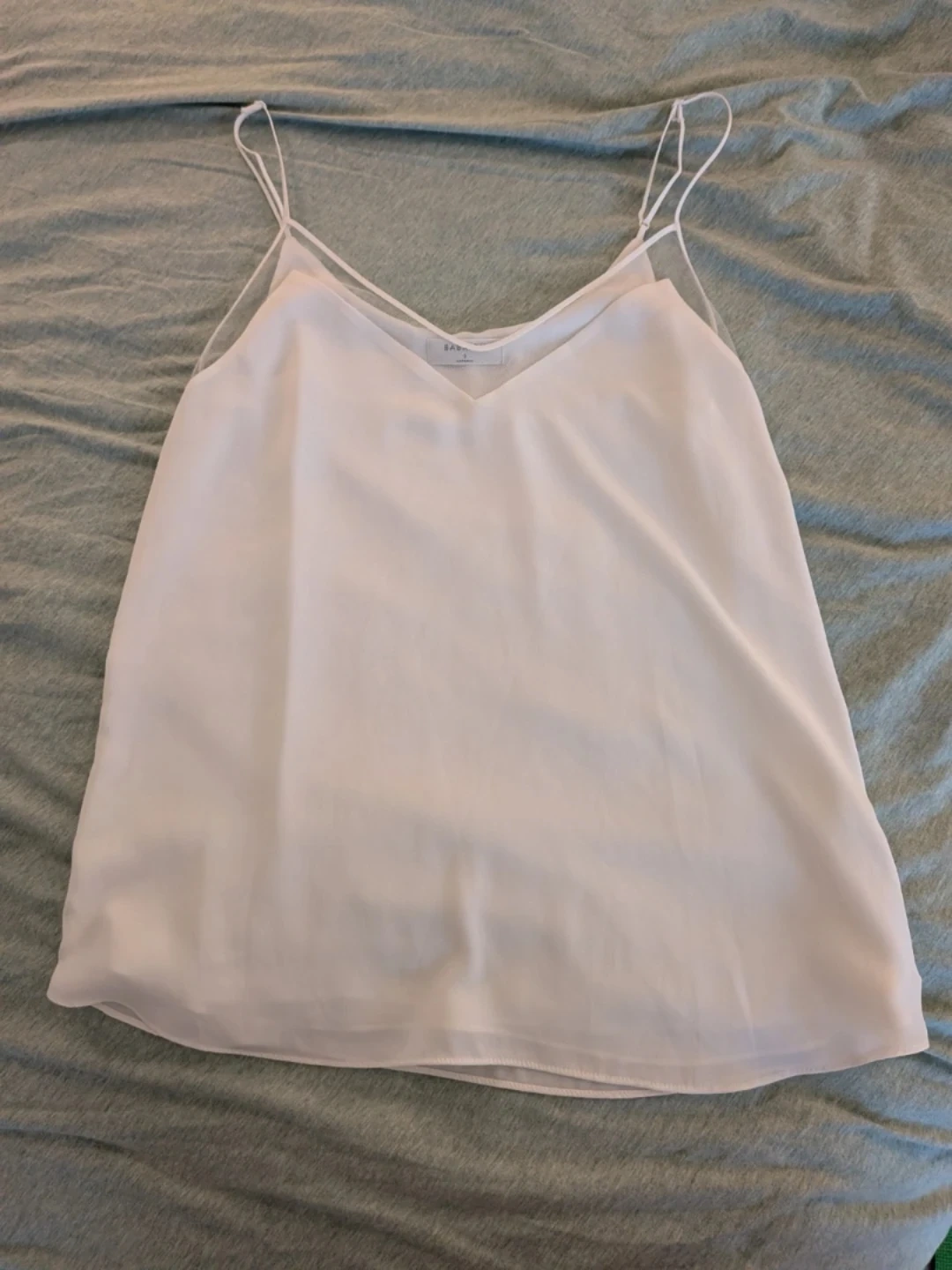White sheer tank top by Babaton. Made with 100% polyester for the body and exclusive of ornamentation. It has delicate adjustable straps and a mesh accent at the neckline. A nice layering piece!
