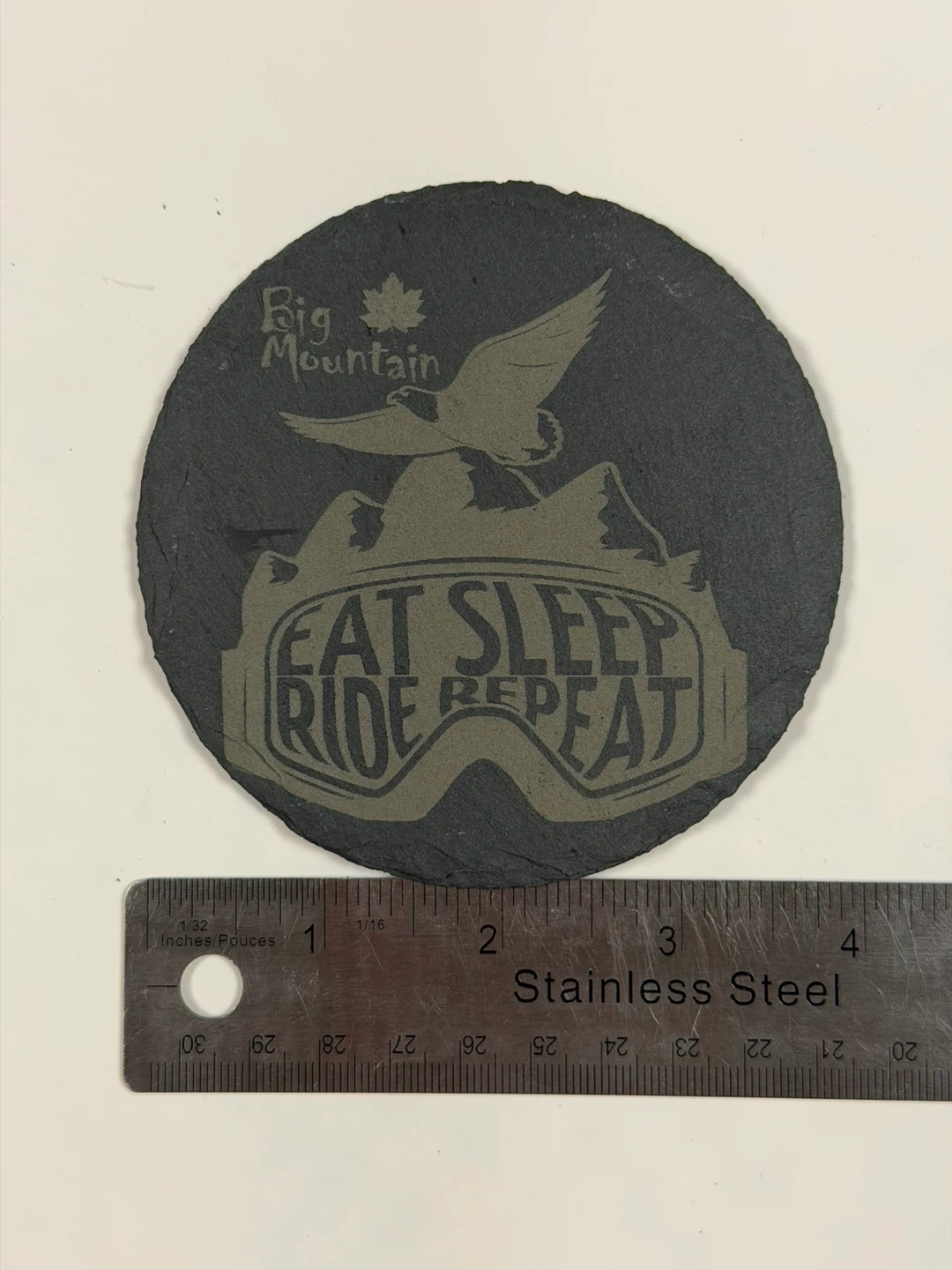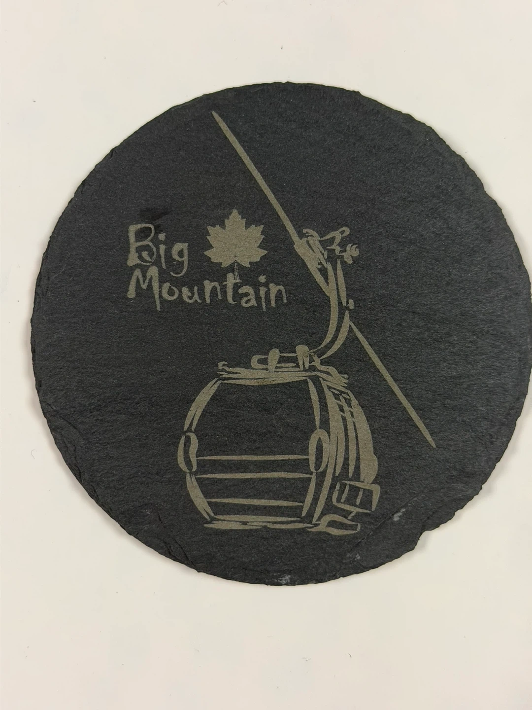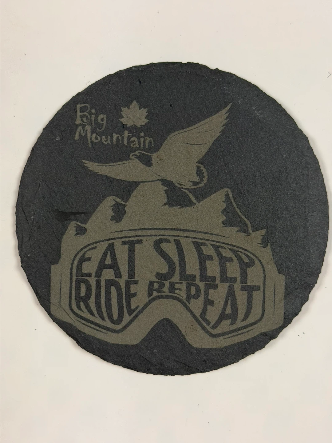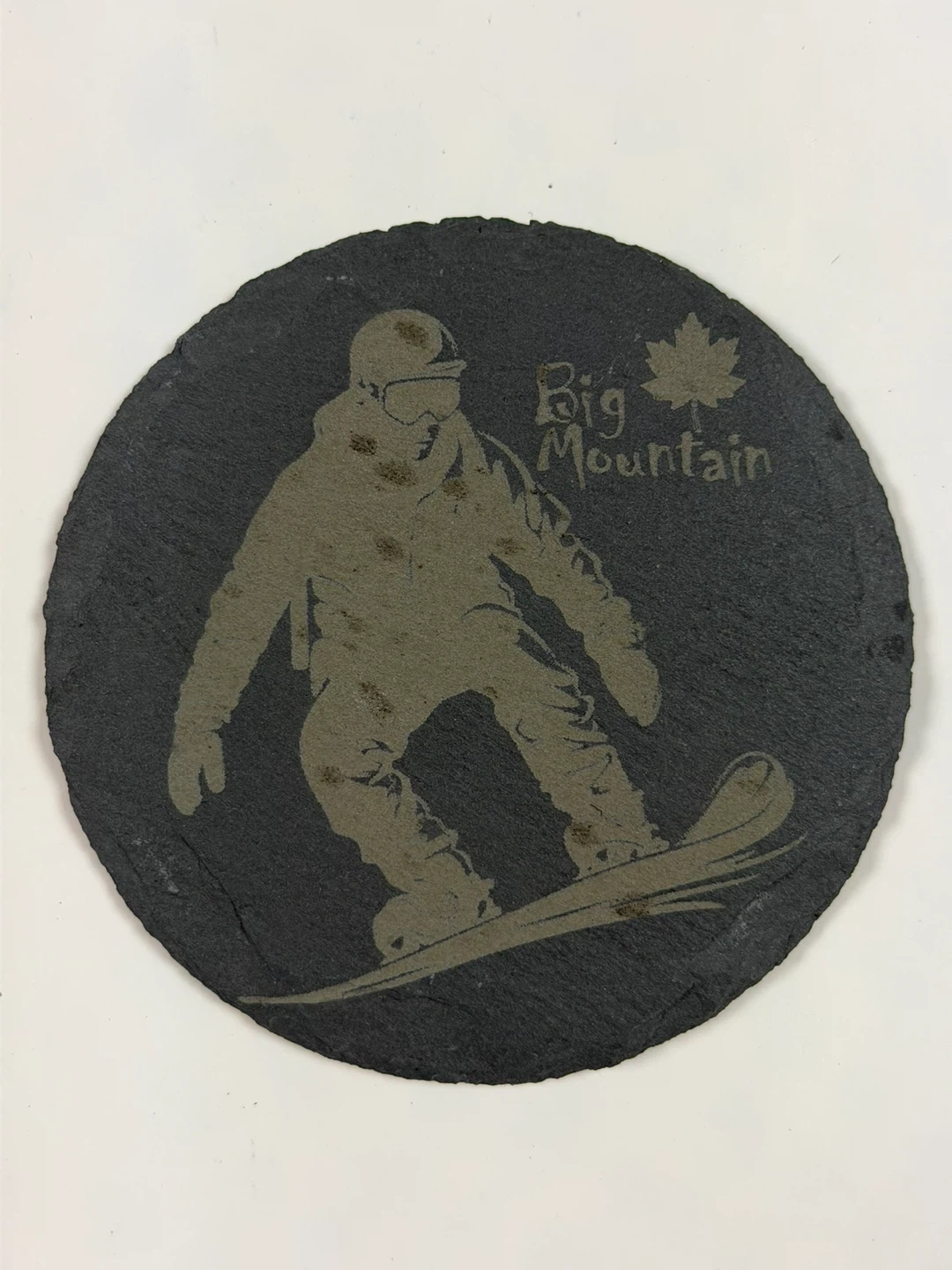 This set includes four slate coasters featuring Canadian mountain themes. Designs include a gondola, an eagle with goggles, and snowboarders. They're made of durable slate. with anti slip backing support and also to avoid table surfaces scratches. made in canada