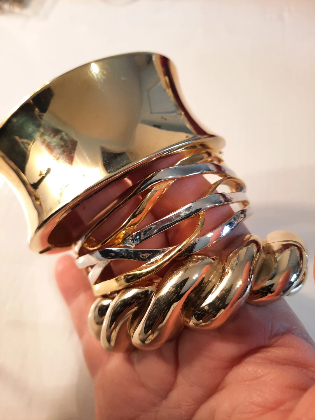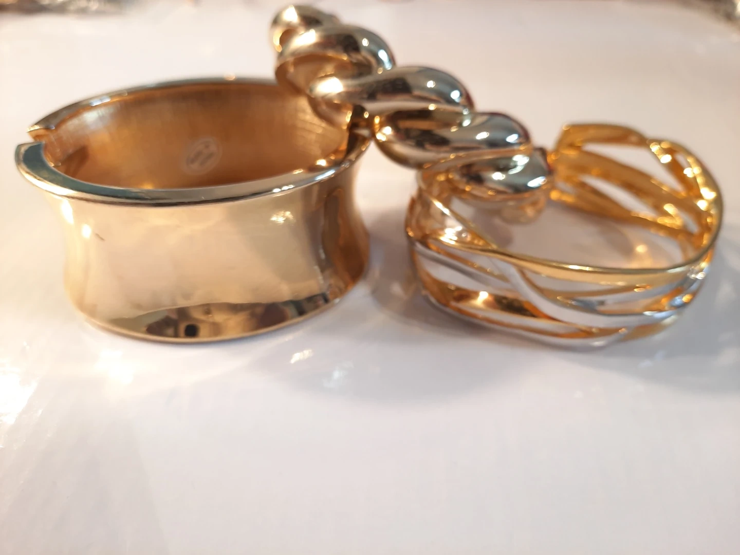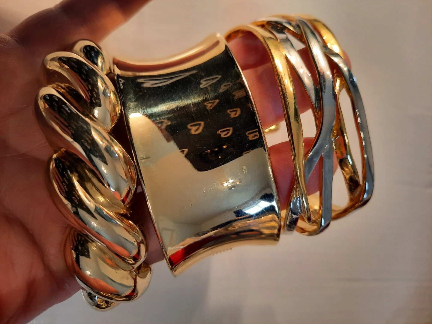Three stylish gold-tone bracelets. Includes a wide cuff, a twisted rope design, and a wavy layered cuff. These pieces add a bold statement to any outfit!2 of them open to put it trough.