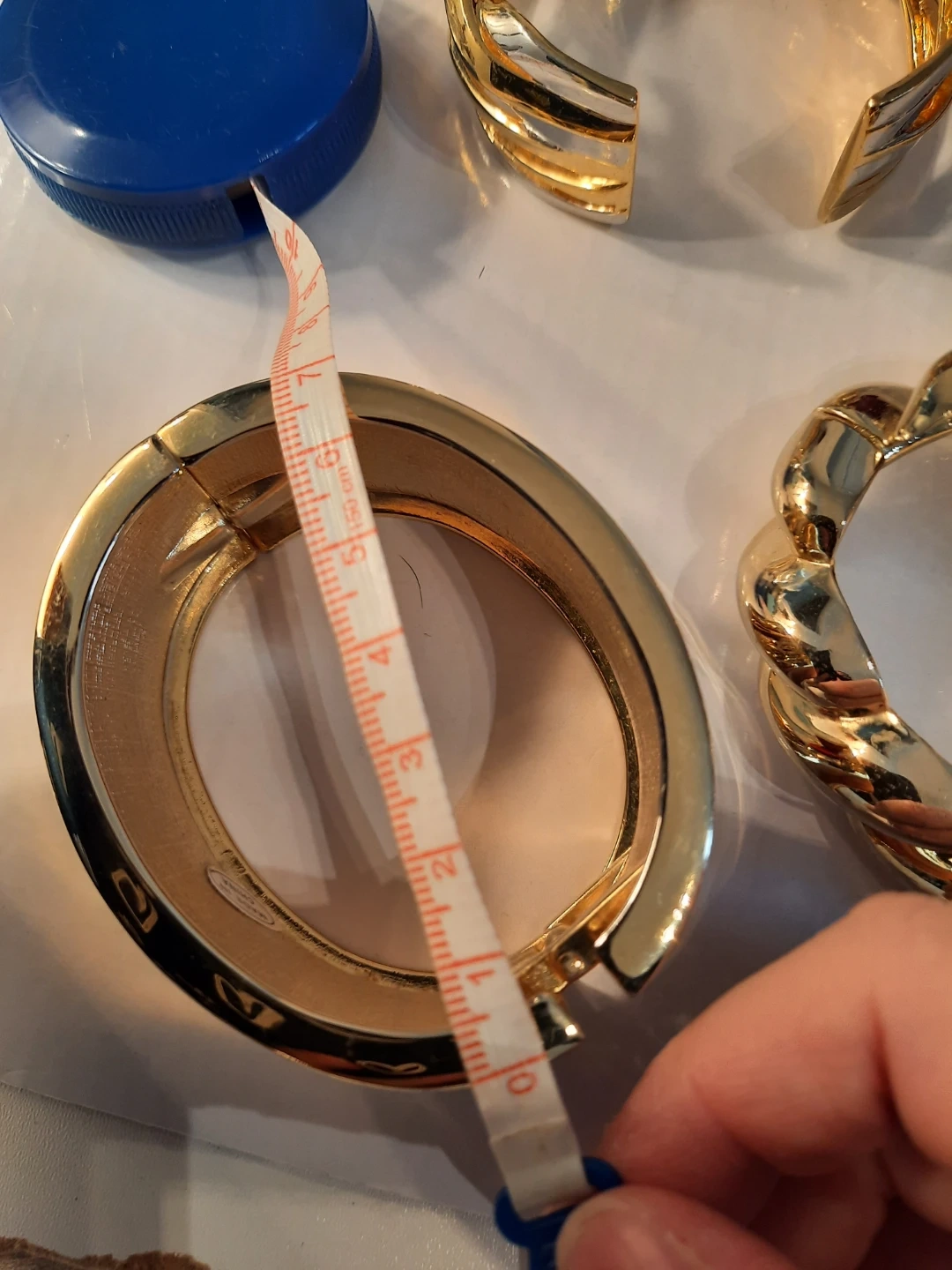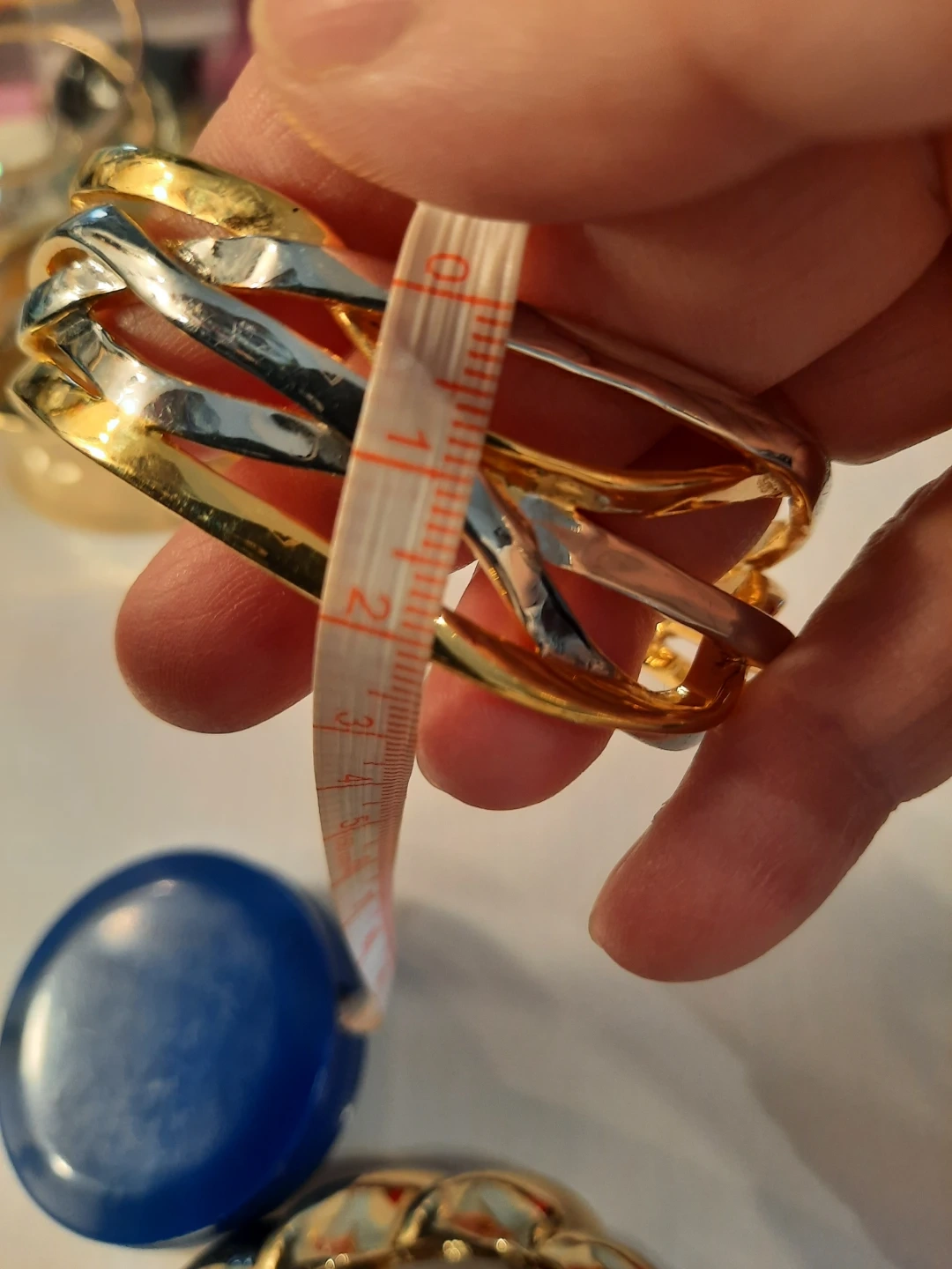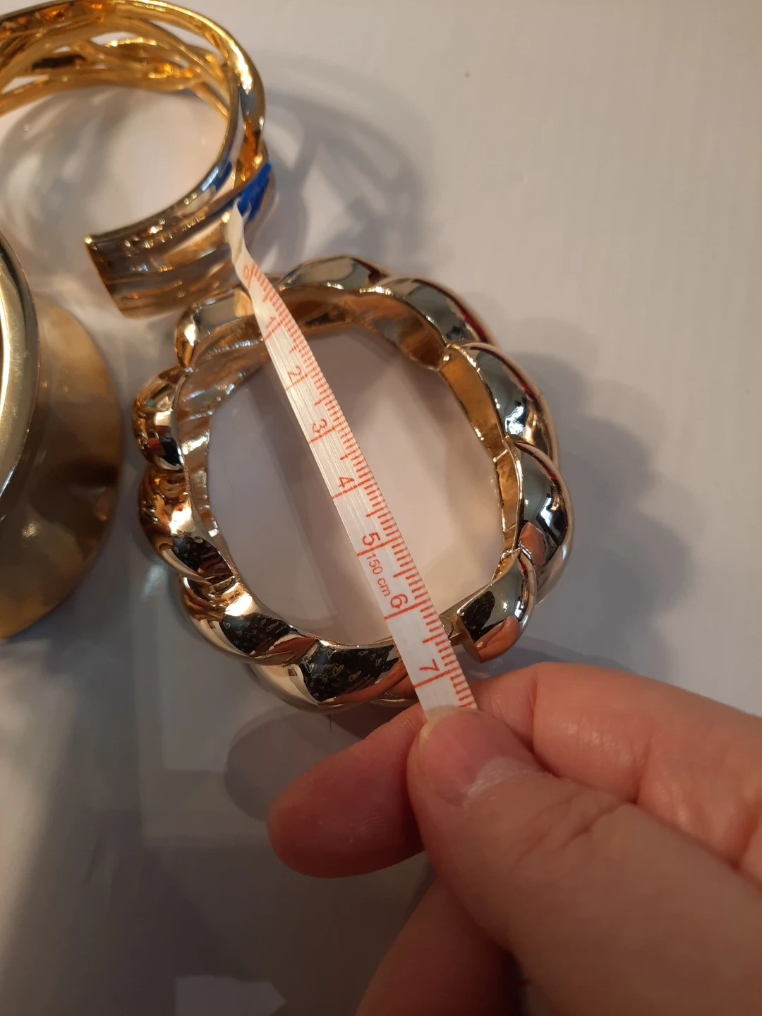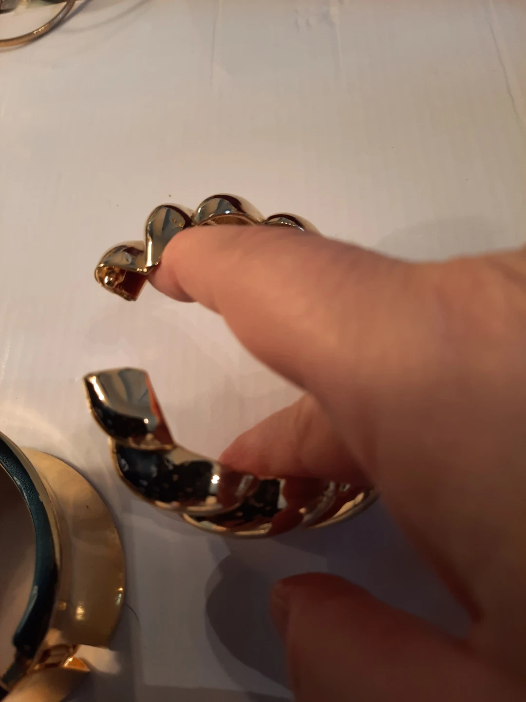 Three stylish gold-tone bracelets. Includes a wide cuff, a twisted rope design, and a wavy layered cuff. These pieces add a bold statement to any outfit!2 of them open to put it trough.