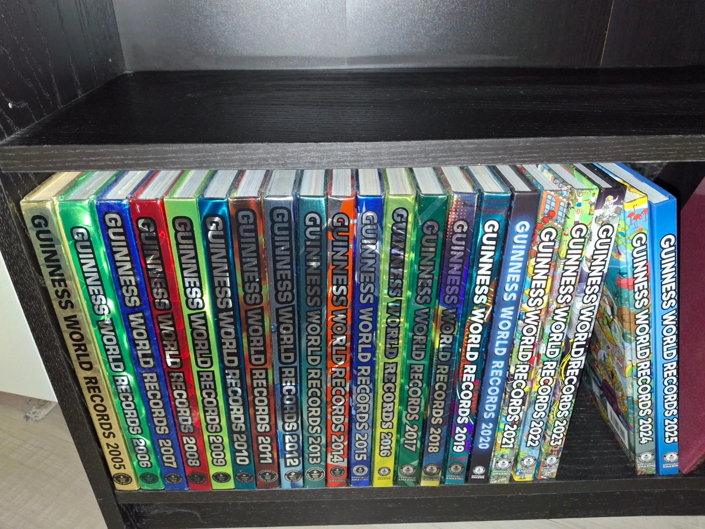 A collection of Guinness World Records books spanning from 2005 to 2025. These books contain a vast array of amazing facts and achievements. Perfect for trivia buffs and anyone curious about the extraordinary!