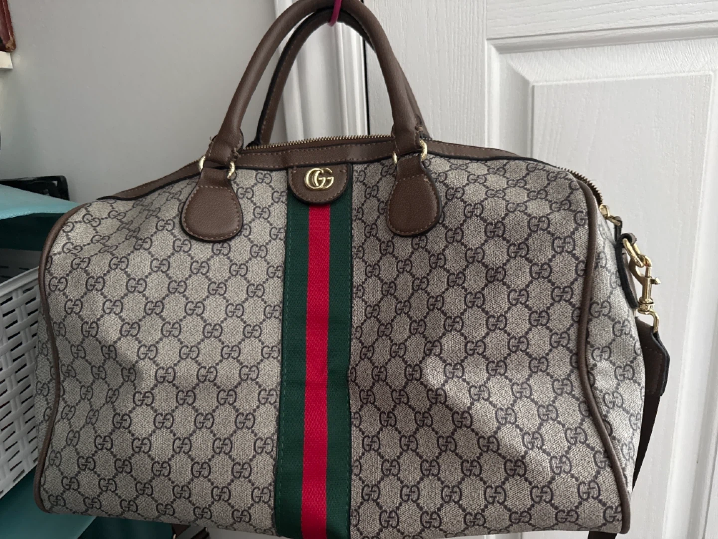 This Gucci duffel bag is made from the brand's signature monogram canvas with brown leather trim. It features the iconic green and red stripe detail. It's a stylish option for weekend trips or as a carry-on.
