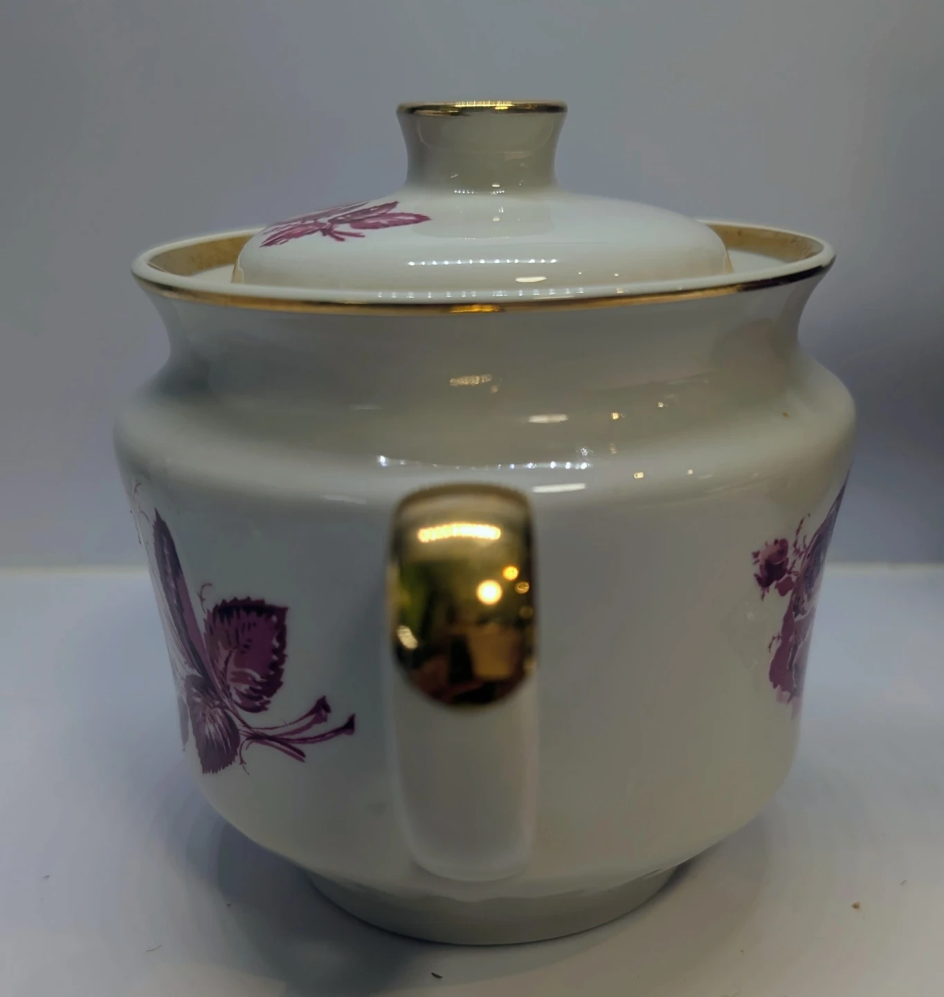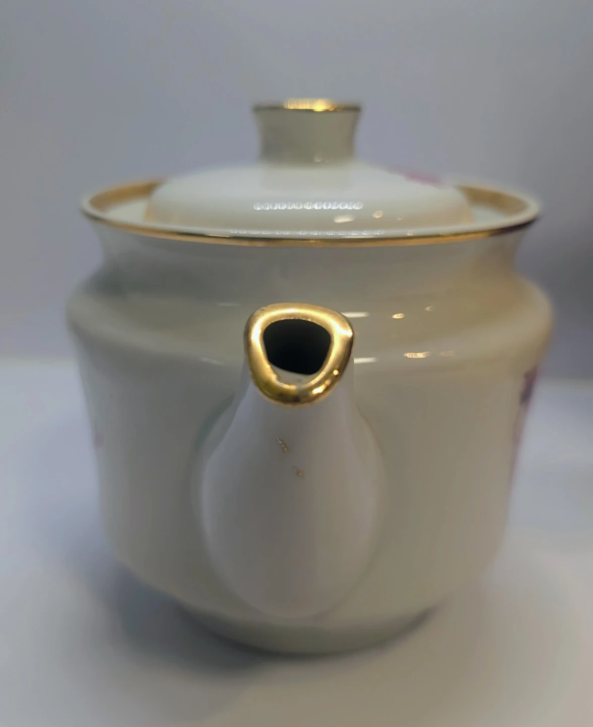 Very pretty teapot available in USSR 1960-1980s. In original condition, no chips or staining. Gold is hand painted, so there is some gold dripeed on the spout by the artisan that decorated this piece.
