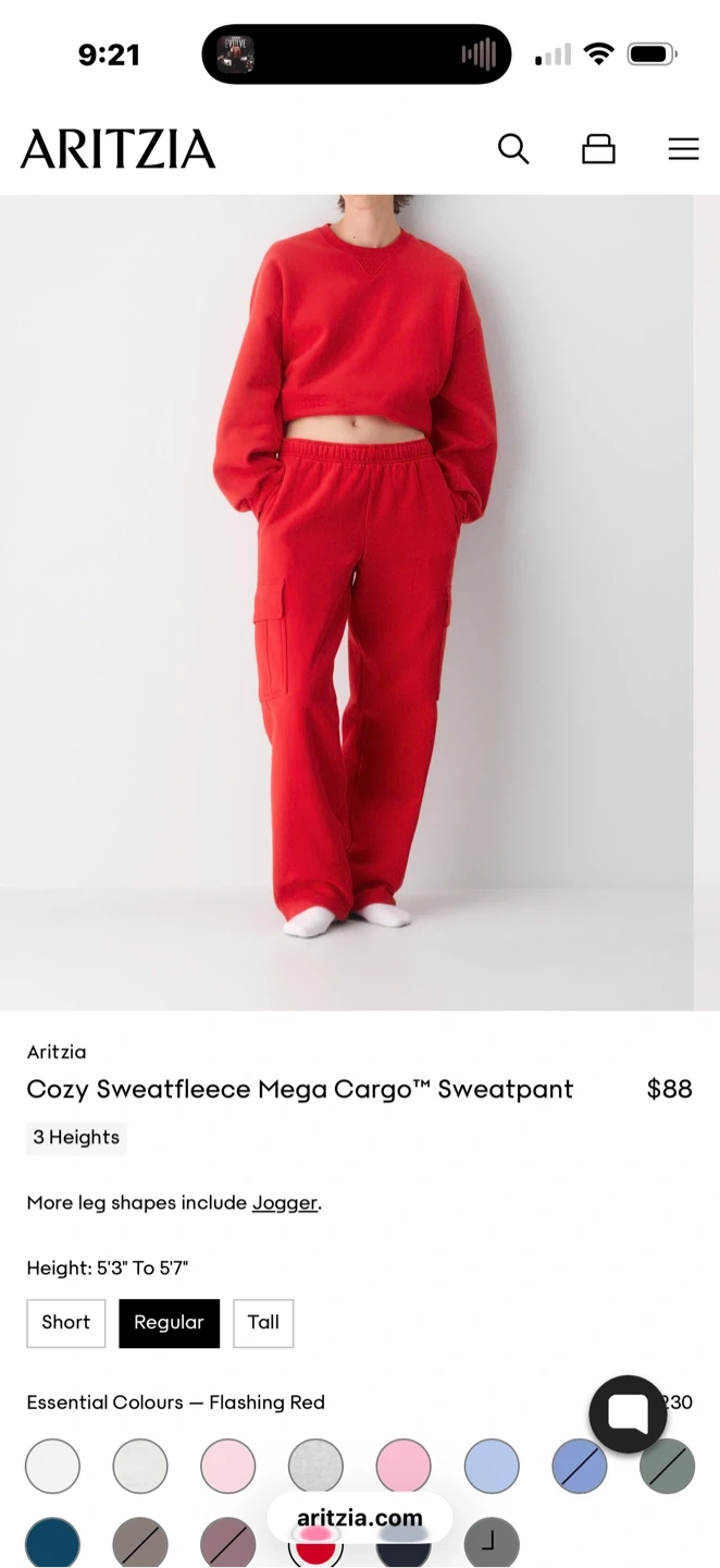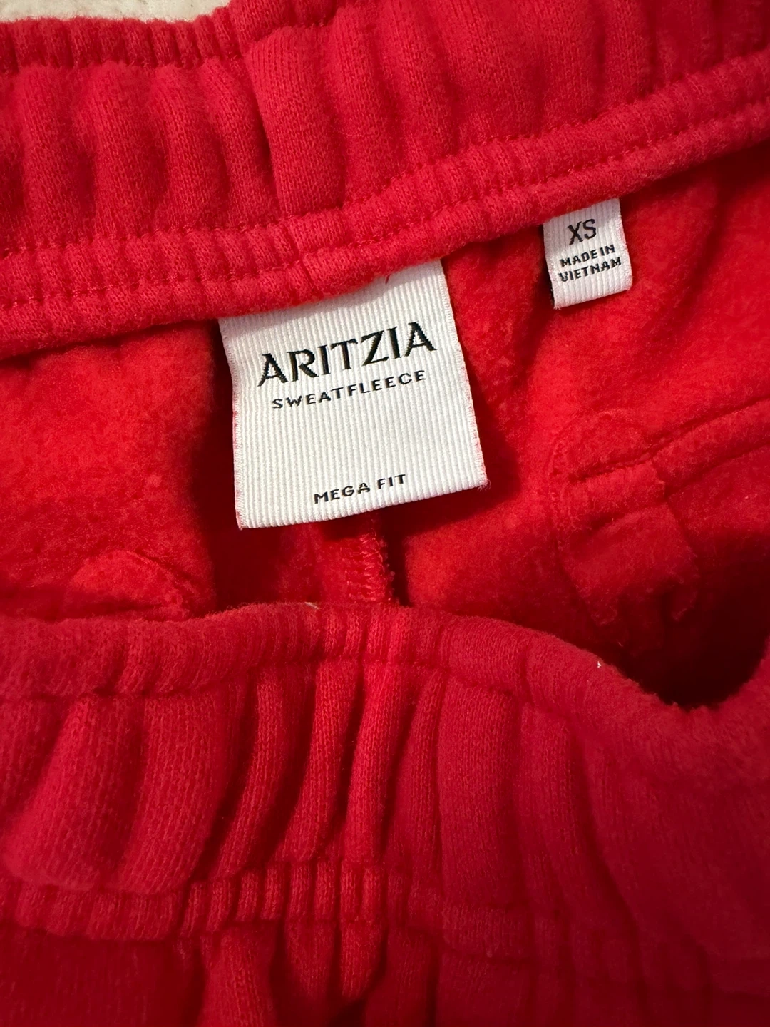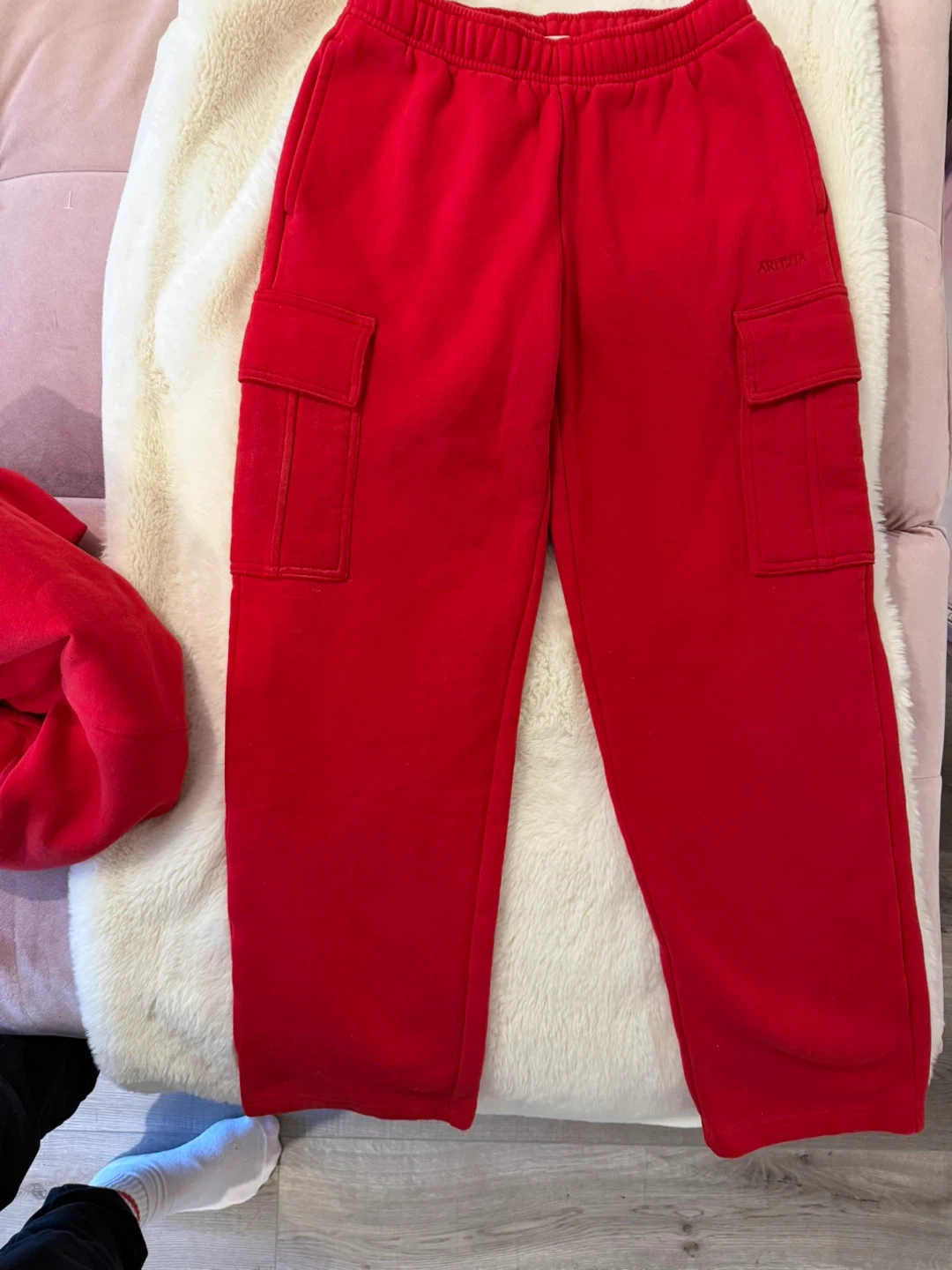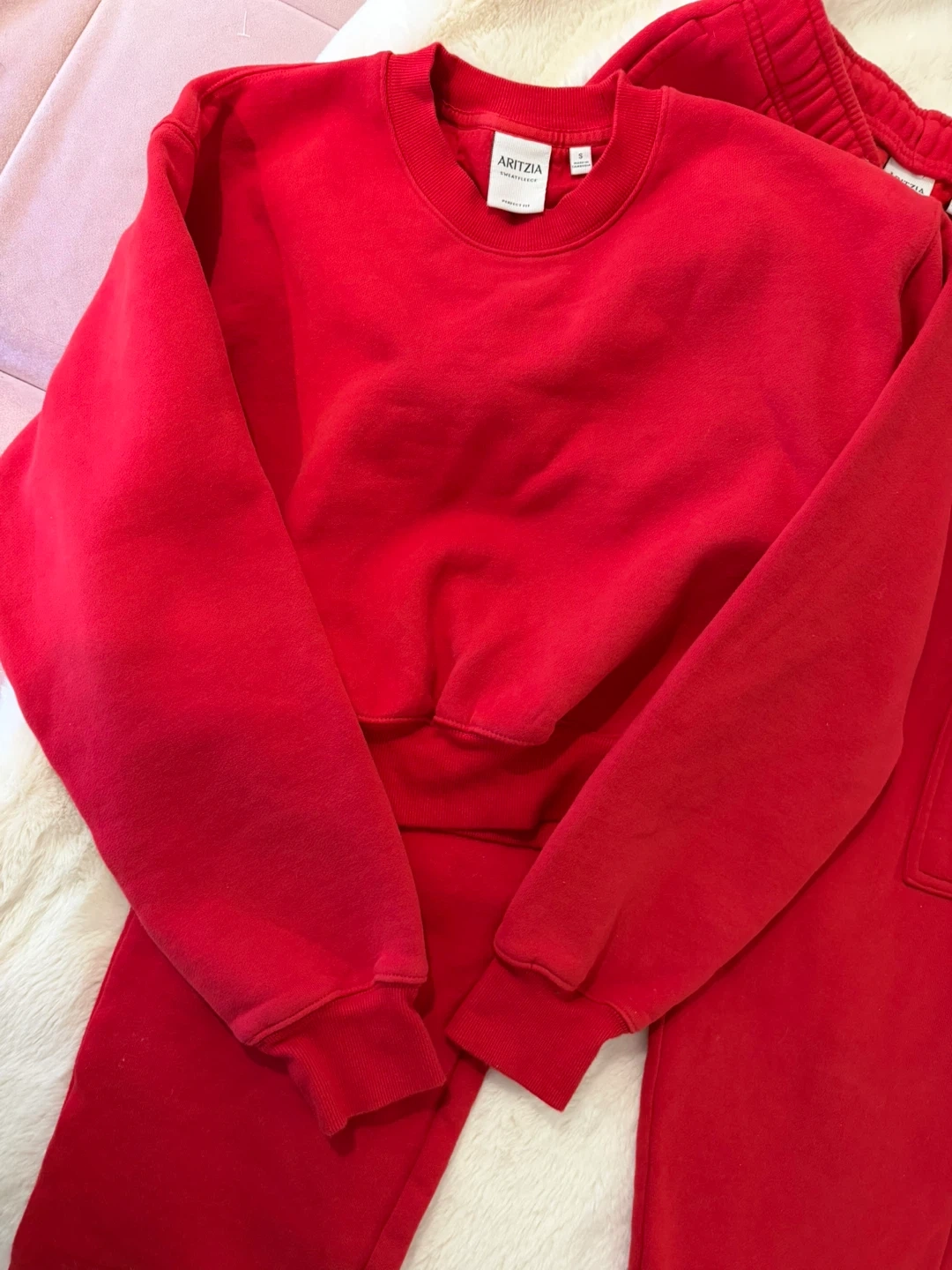 Selling an Aritzia Sweatfleece set in size Small & the Mega Cargo Pants in XS and the Perfect Crew. Both are in a vibrant red colour and feature the cozy Sweatfleece material. Perfect for lounging or casual wear!
