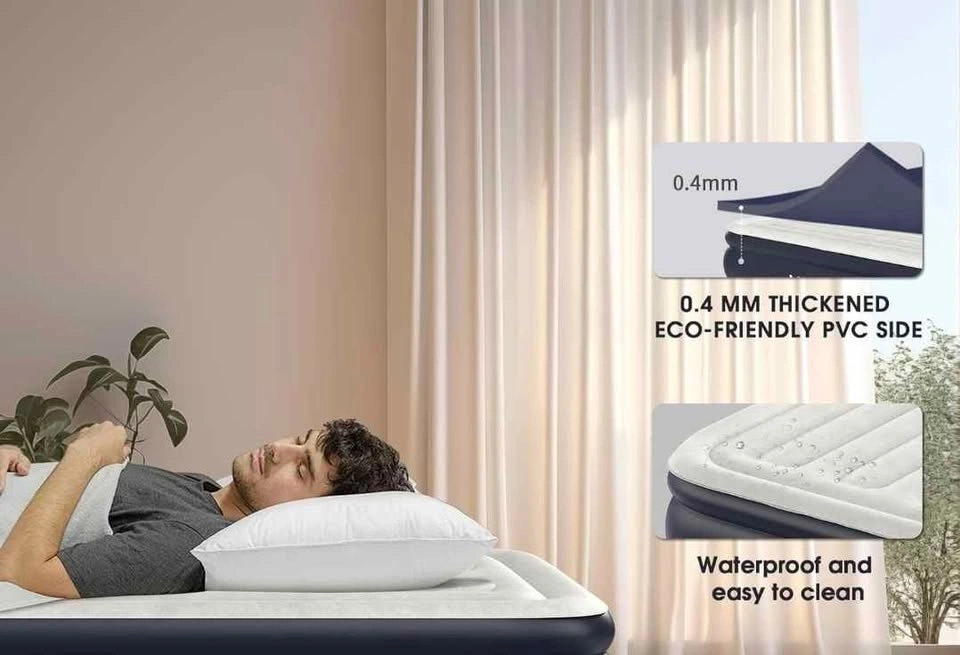 Experience ultimate comfort with our velvety top surface. This plush layer offers a superior feel against your skin, promoting deep, restful sleep throughout the night. The waterproof and easy-to-clean design ensures the inflatable mattress stays cool and nice making it ideal for families with children, both indoors and outdoors.