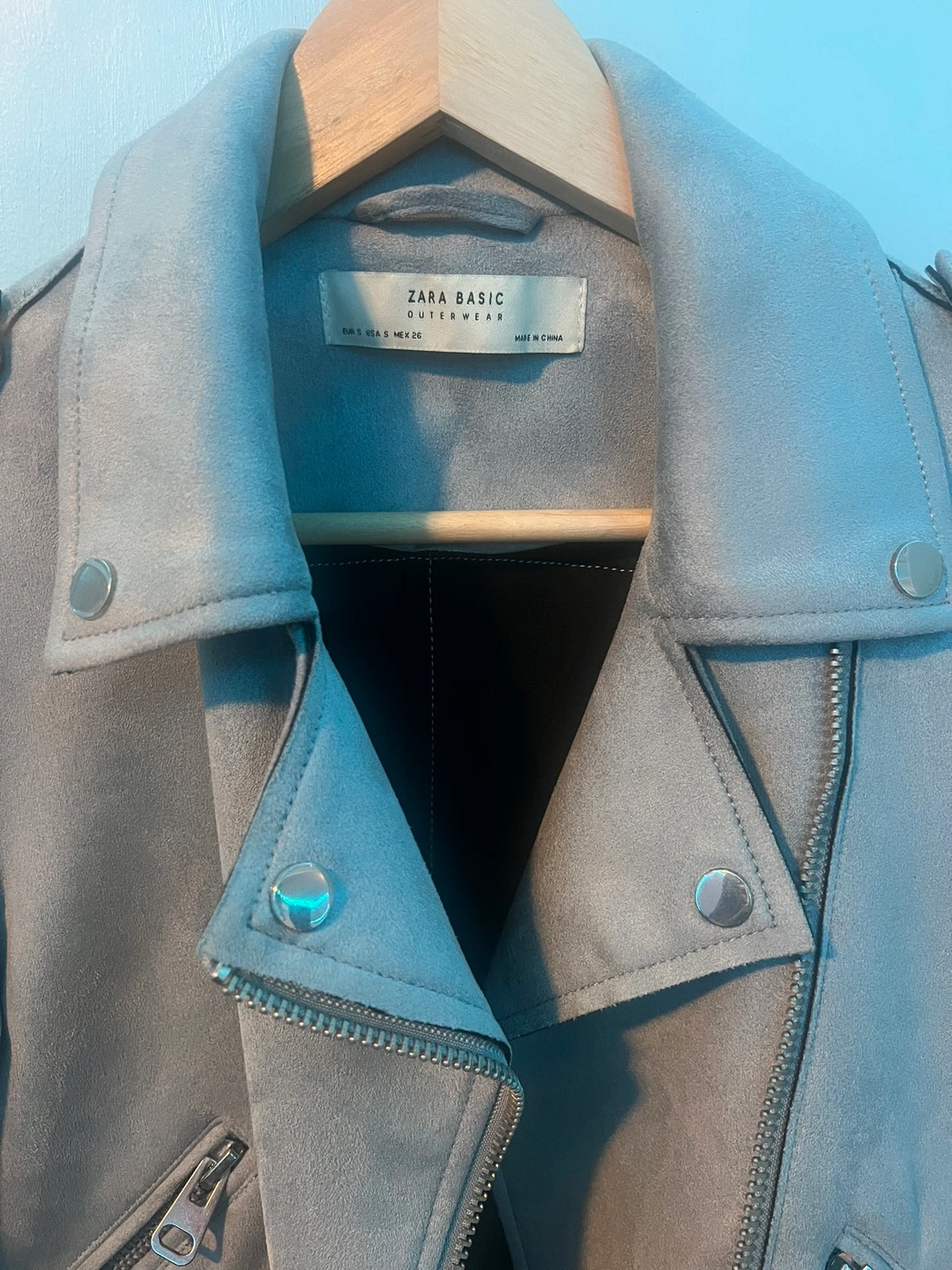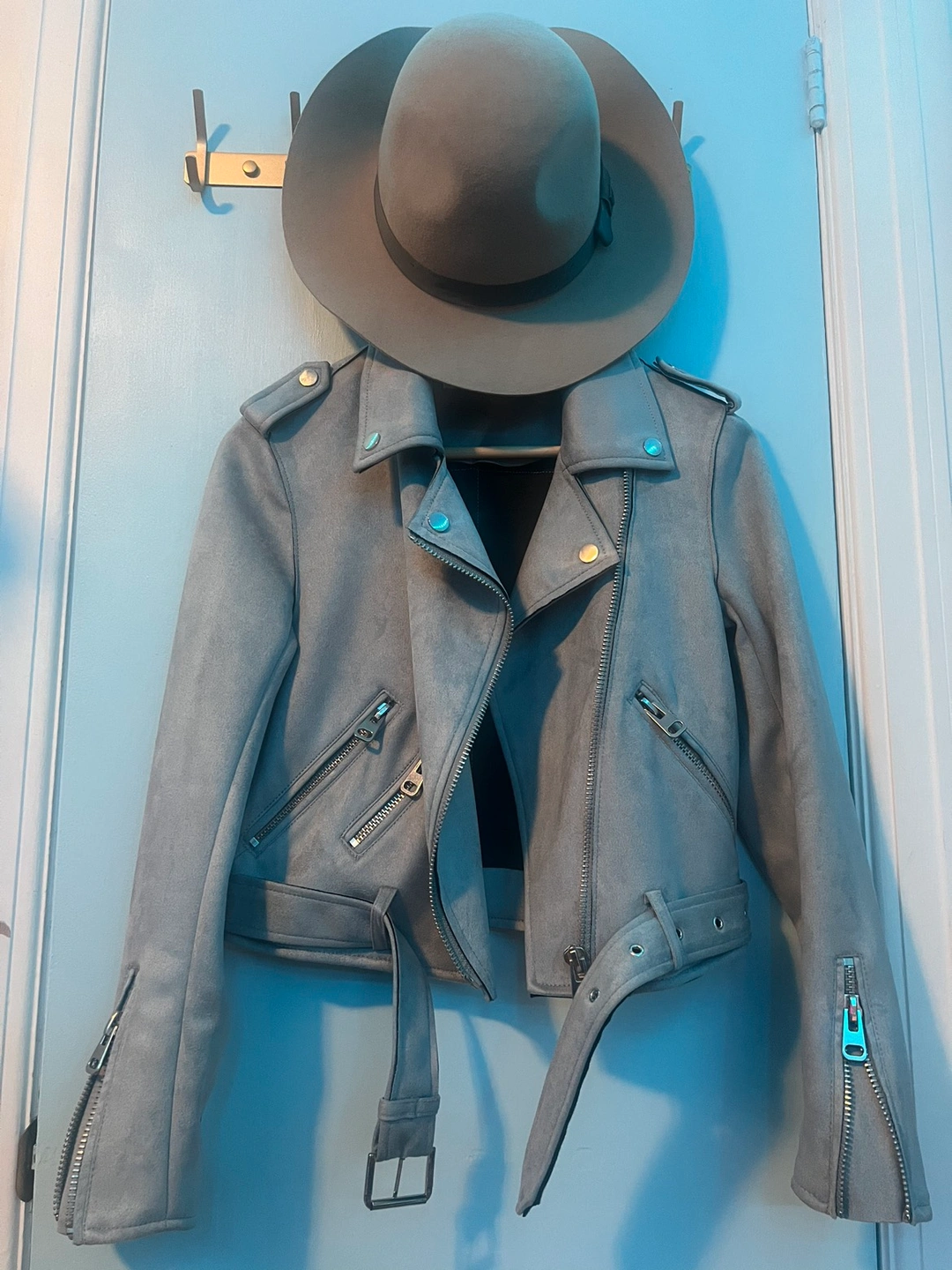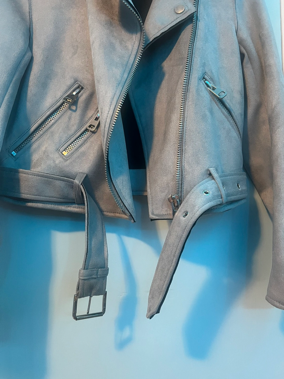 light blue faux suede texture moto style jacket