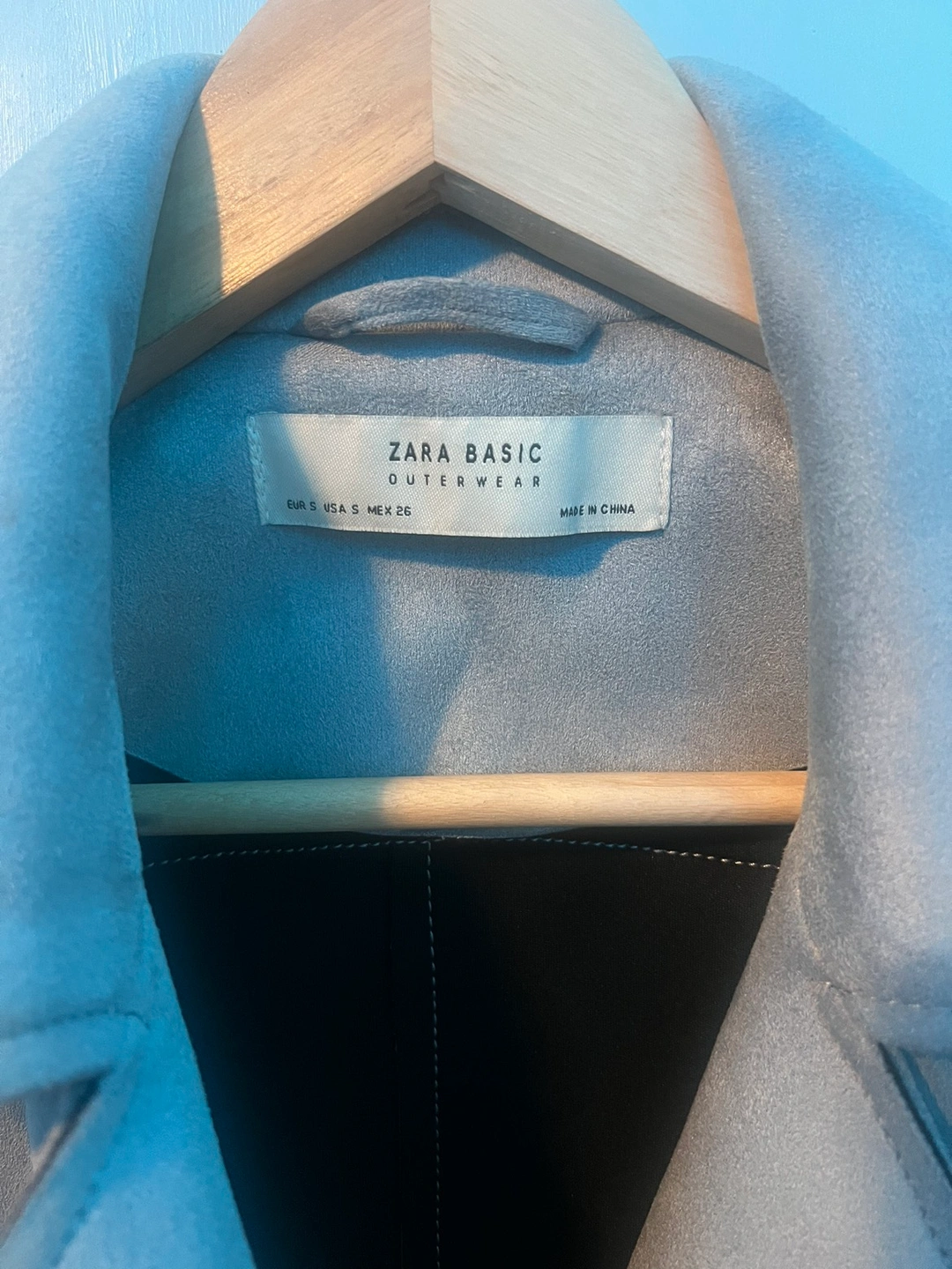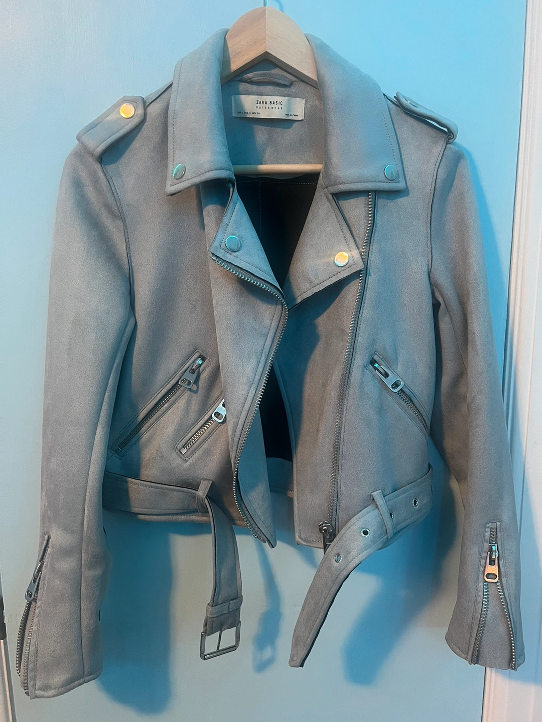 Super cute light blue moto style jacket from Zara. Light weight and perfect for spring. Style it with jeans or a dress!