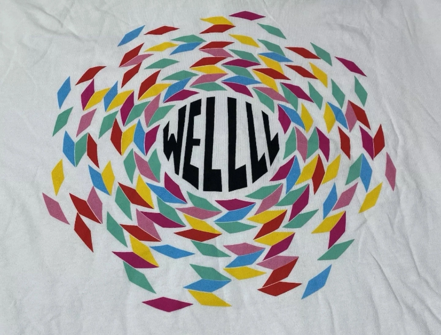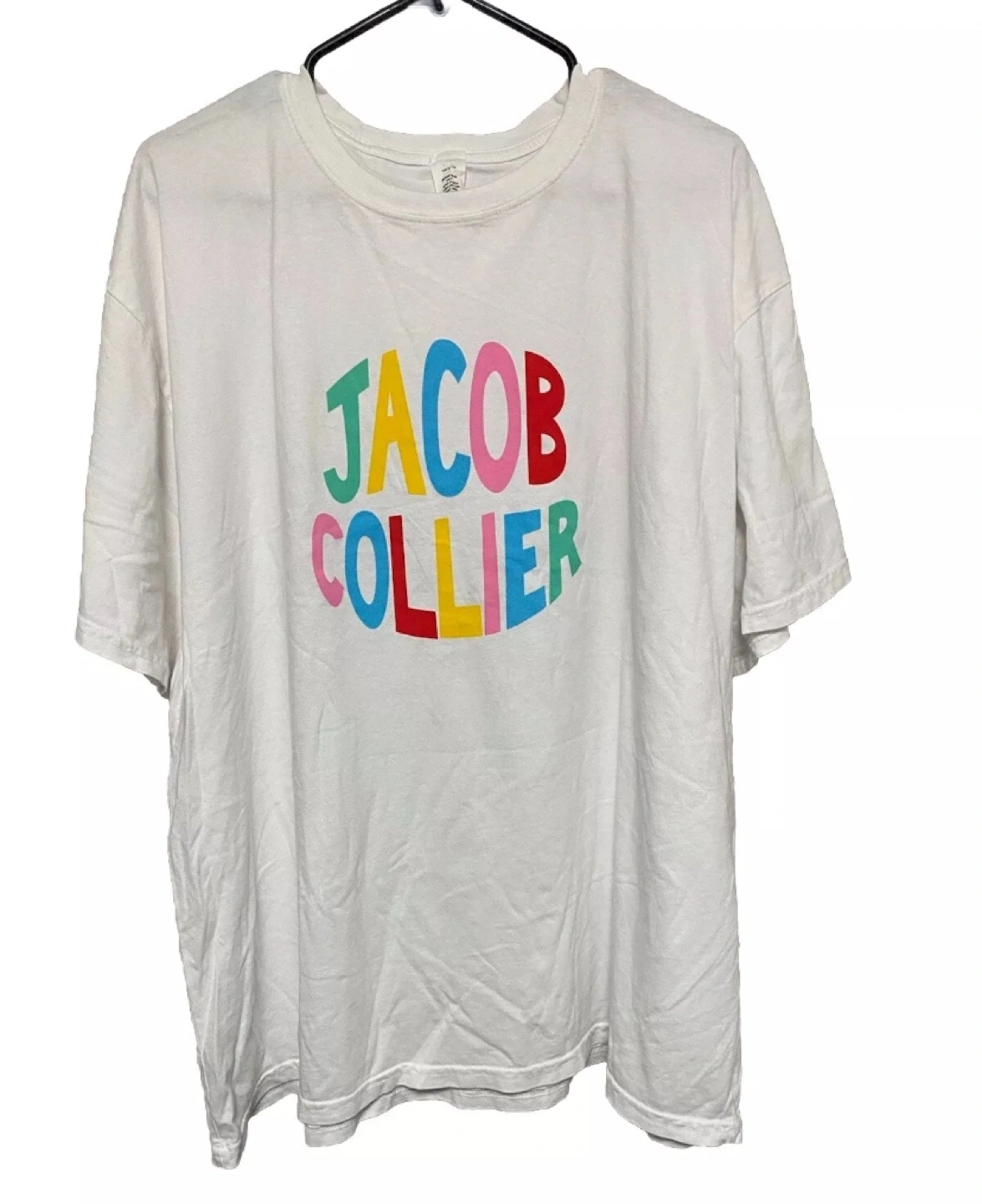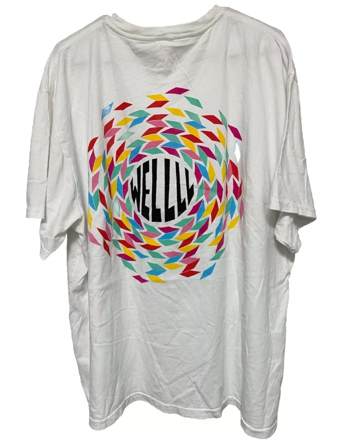 White T-shirt with colourful Jacob Collier graphic on the front and Well graphic on the back.