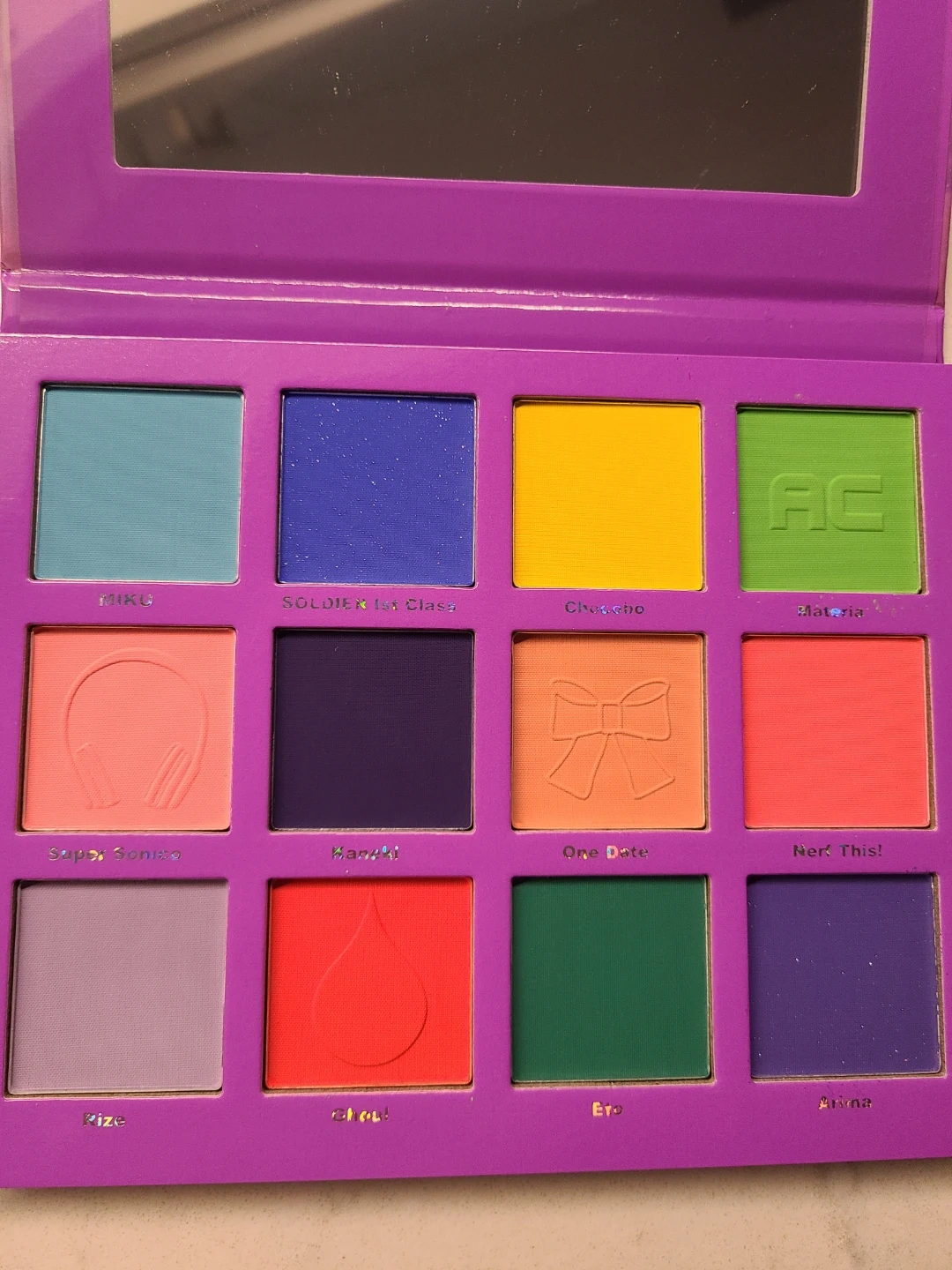 Alien Cosmetics CAPRICORN eyeshadow palette. It features 12 vibrant shades with a mix of mattes and shimmers. This palette's colours are perfect for creating bold, colourful looks!