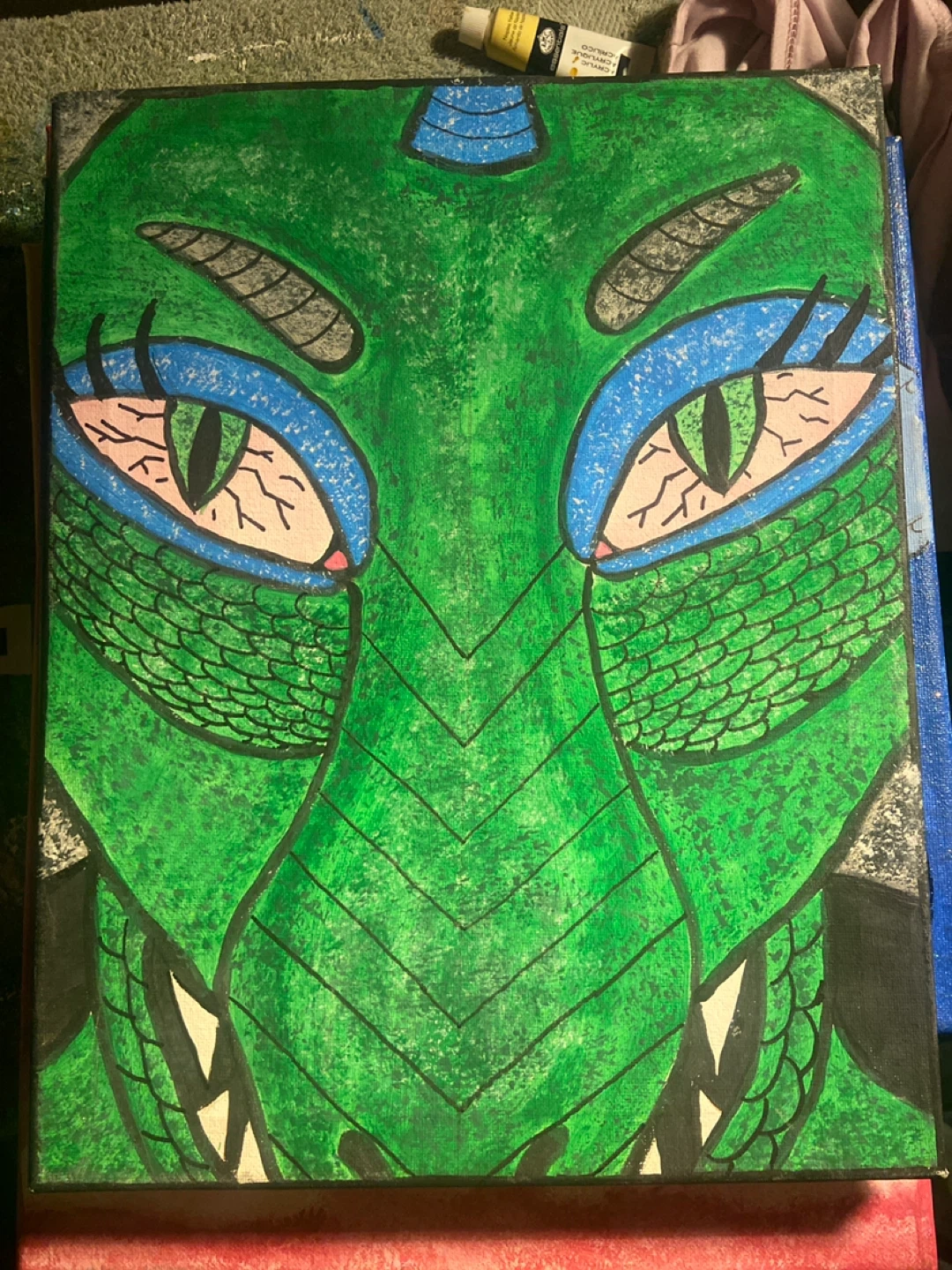 A vibrant acrylic painting of a dragon's face on canvas. The artwork features a detailed green dragon with striking blue accents around its eyes. It's a unique piece for any fantasy art enthusiast!