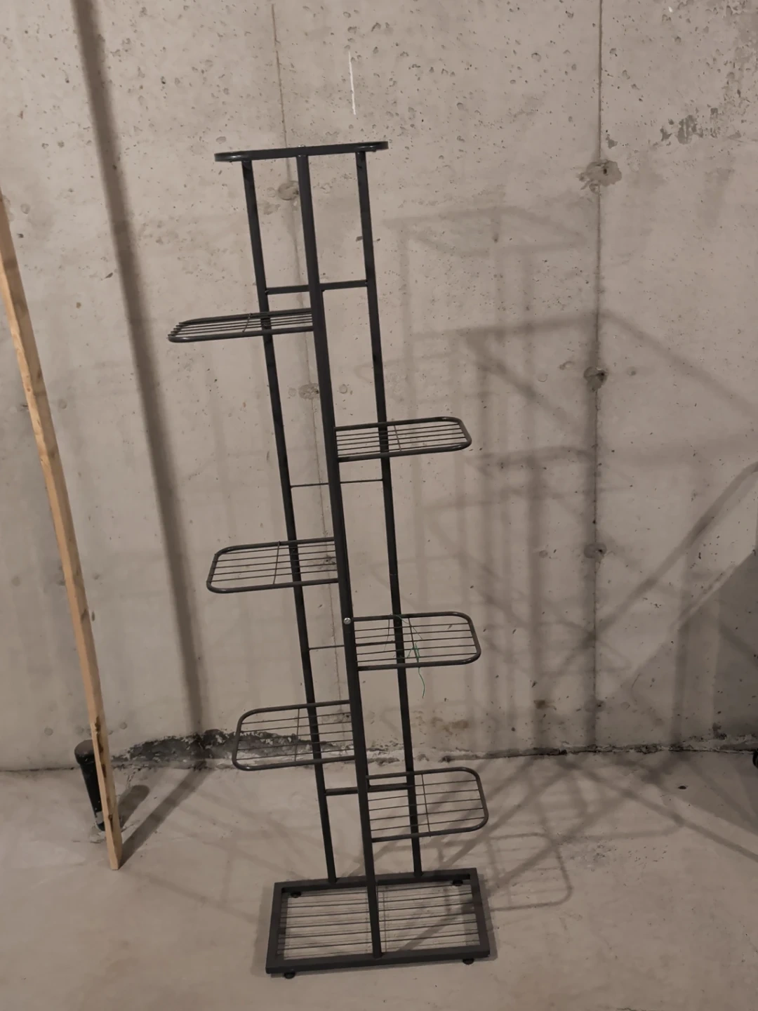 This is a black metal plant stand with multiple shelves. It has five tiers for displaying plants. It's great for indoor or outdoor use.