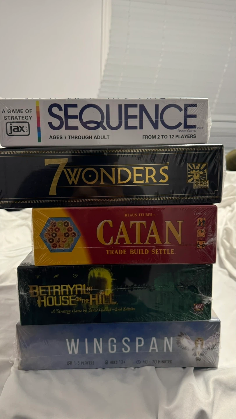 Selling a collection of five popular board games, all still sealed and new. Includes Sequence, 7 Wonders, Catan, Betrayal at House on the Hill (2nd Edition), and Wingspan. Great for game nights with friends or family!