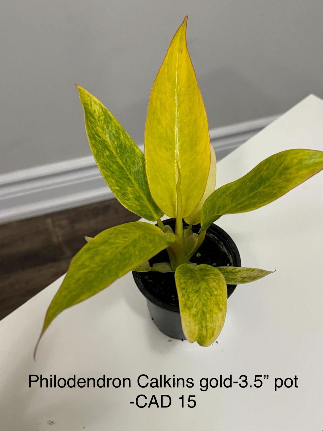 Philodendron Calkins Gold plant in a 3.5" pot. Beautiful variegated yellow and green leaves. It's a lovely houseplant that adds a pop of colour to any space!
