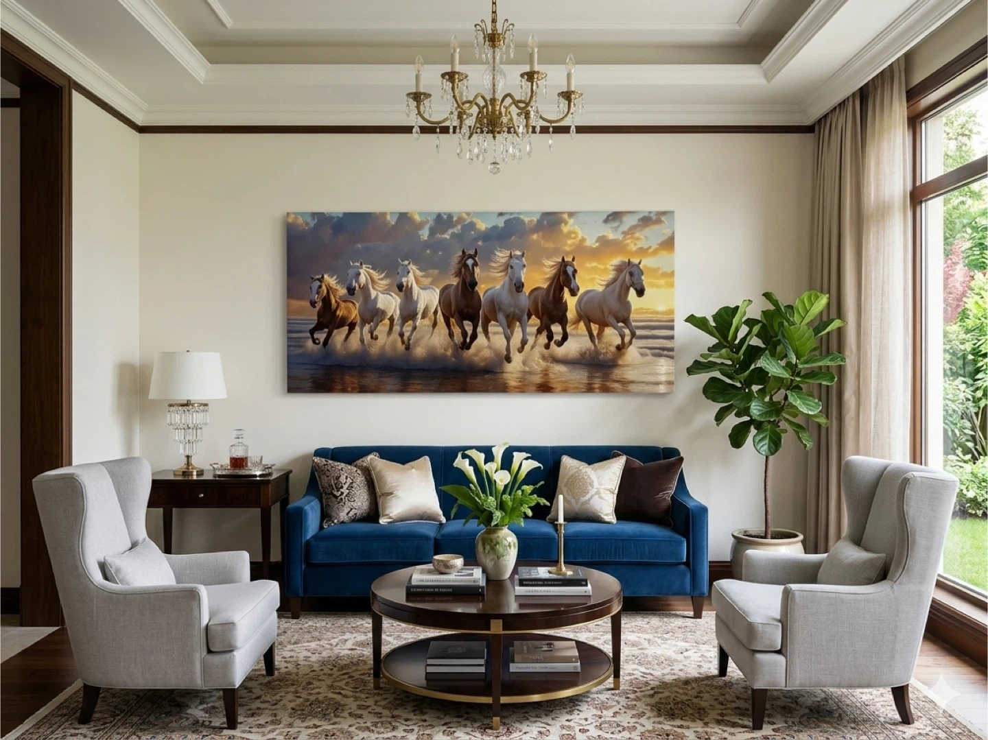 Beautiful canvas print featuring seven white horses galloping across a beach at sunset. It's a striking piece of art to liven up any room. This artwork is printed on high-quality canvas.