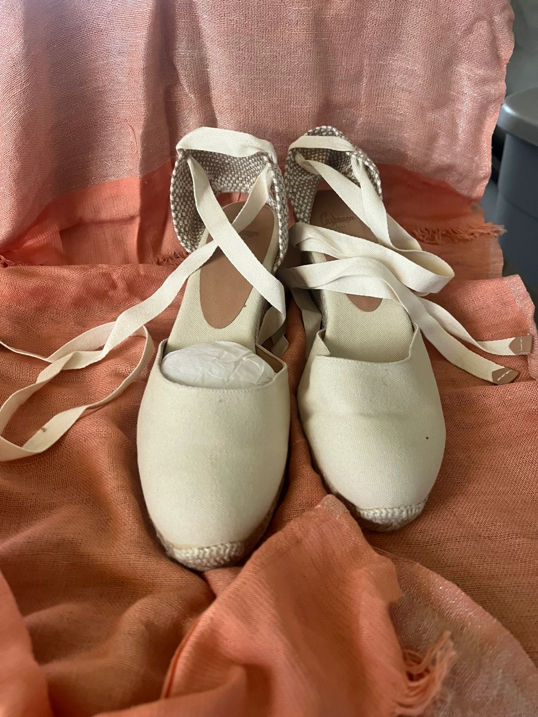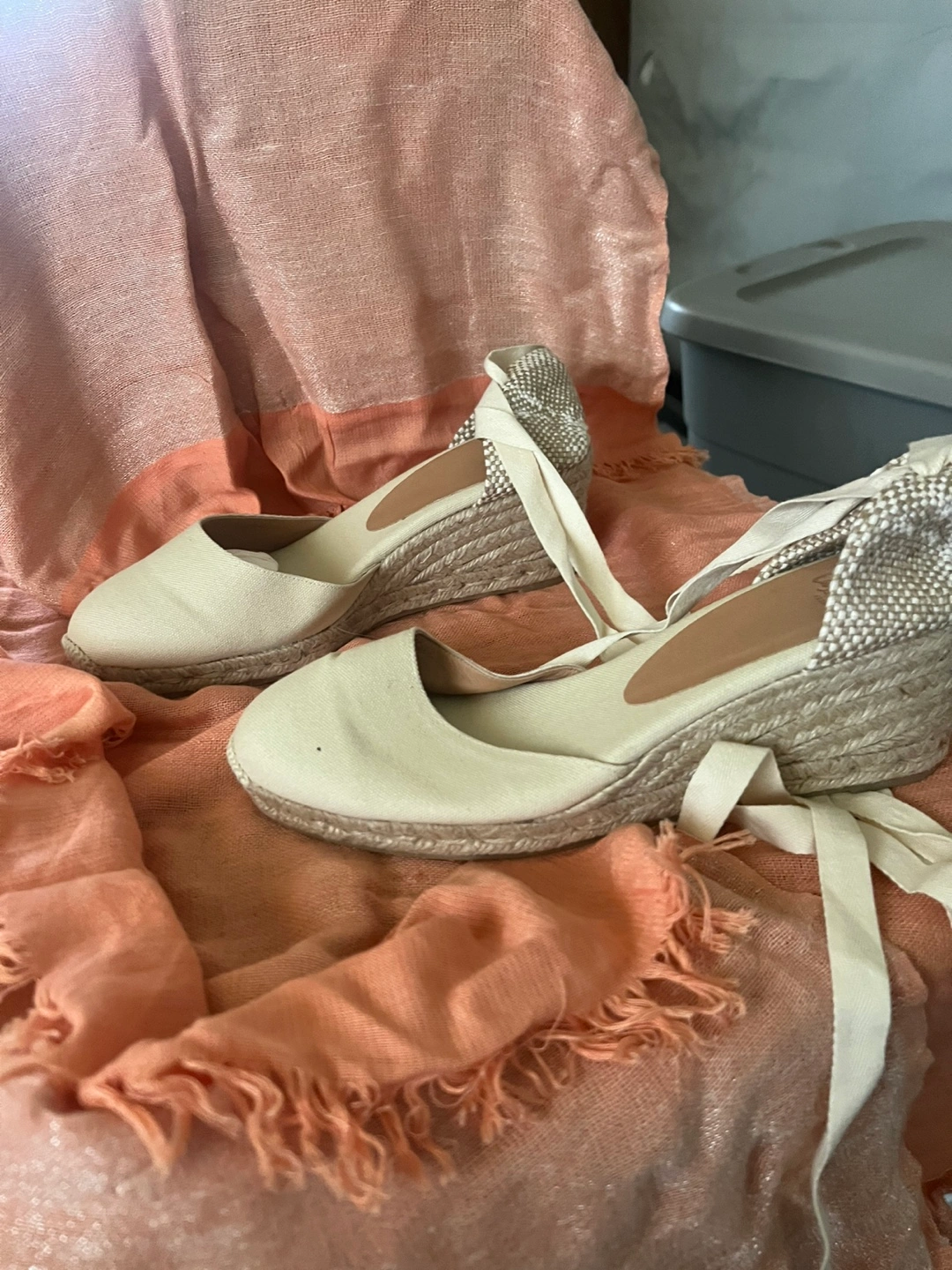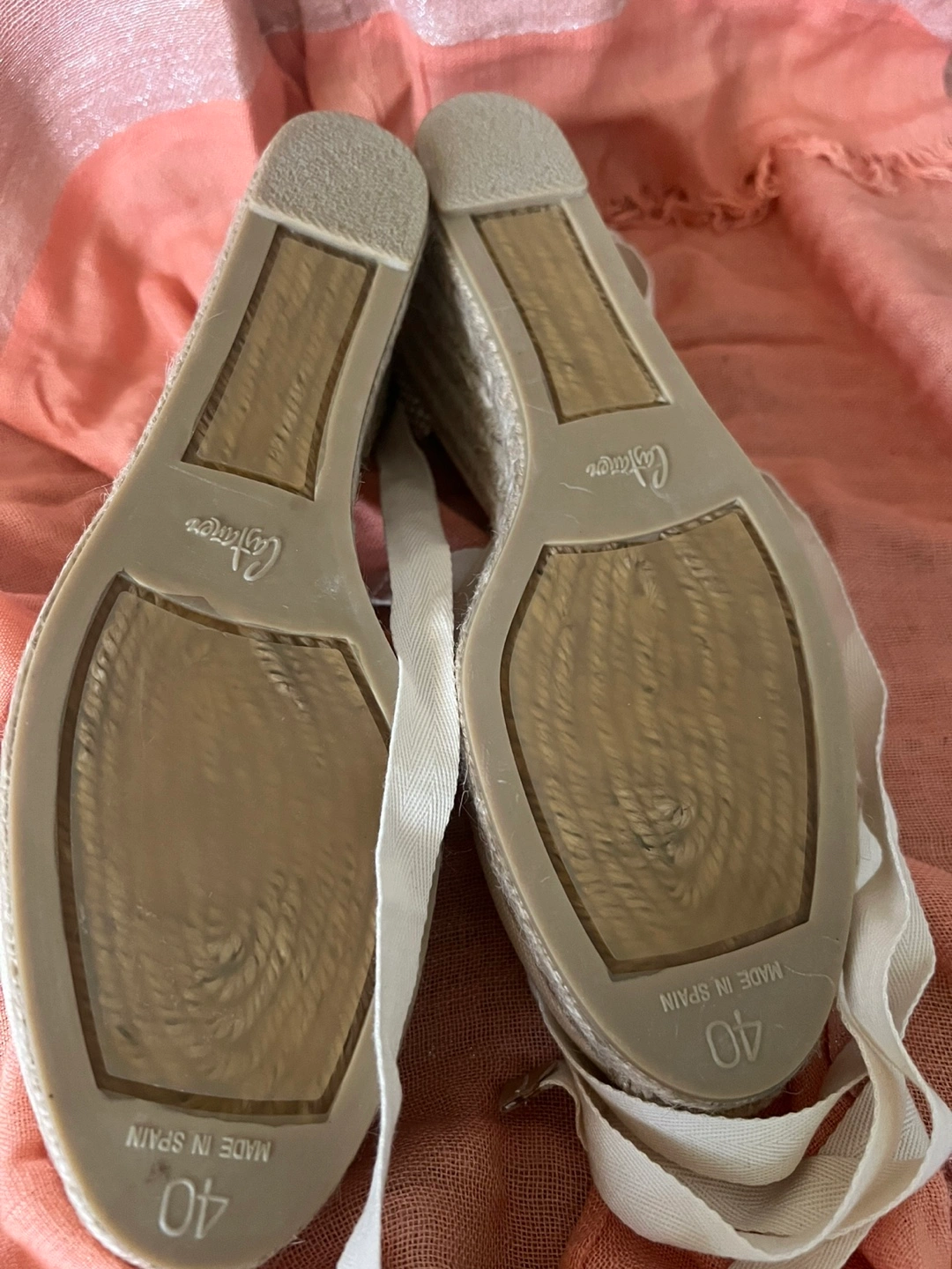 Cream-colored espadrille wedges. Size 40. Made in Spain. Lace-up style. Wedge heel. Canvas upper.