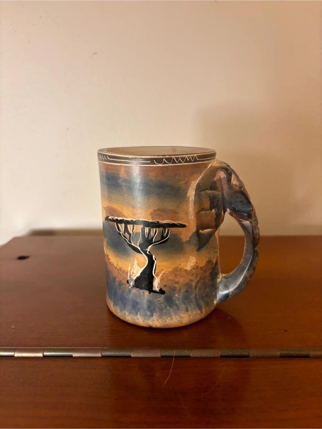 $45 or best offer - Beautiful, unique ceramic mug featuring a hand-carved elephant handle and hand-painted, earth-toned design. The elephant detail is sculpted directly into the handle, giving the piece a striking, tactile, almost sculptural quality you don’t see in mass-produced mugs.