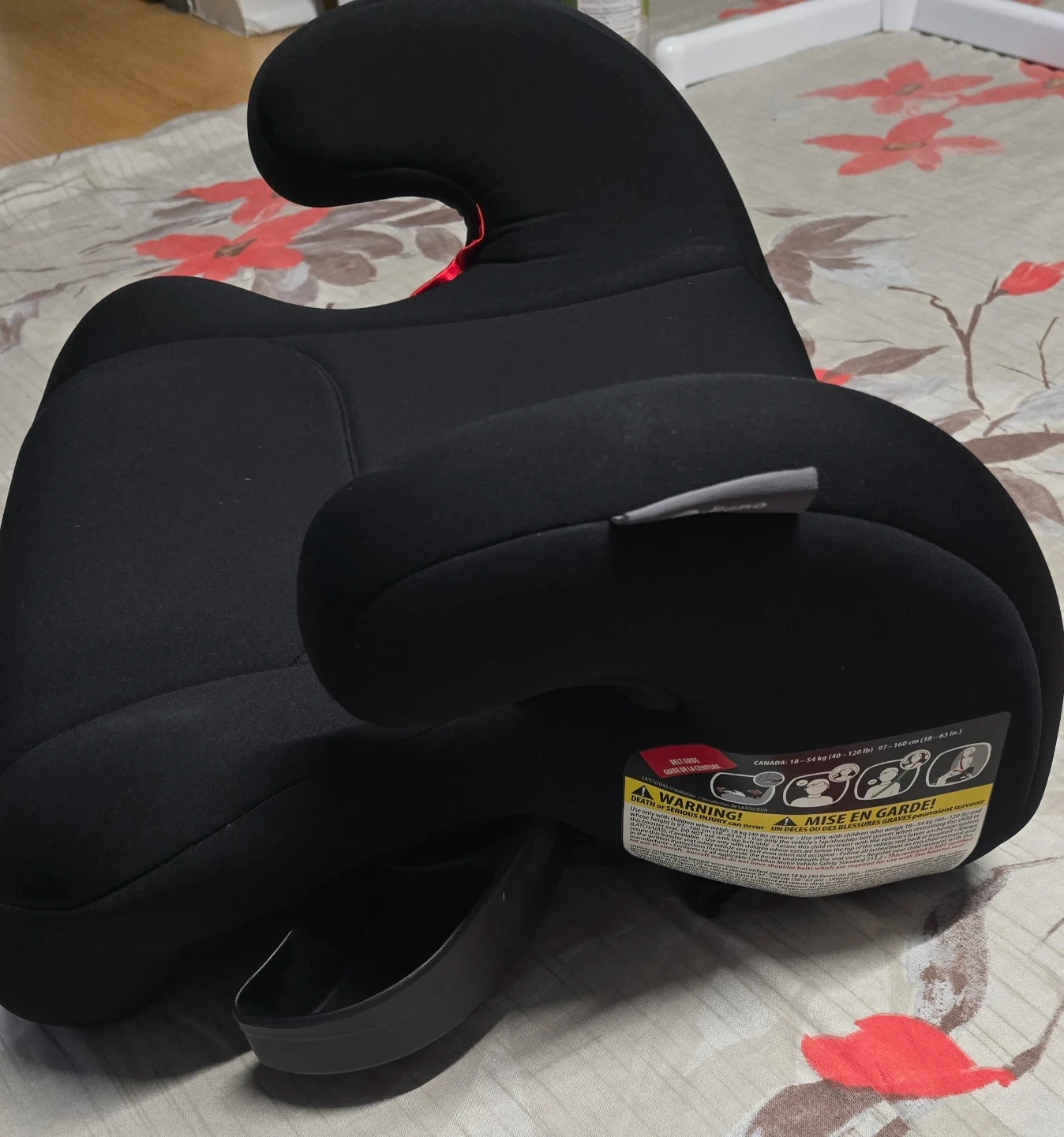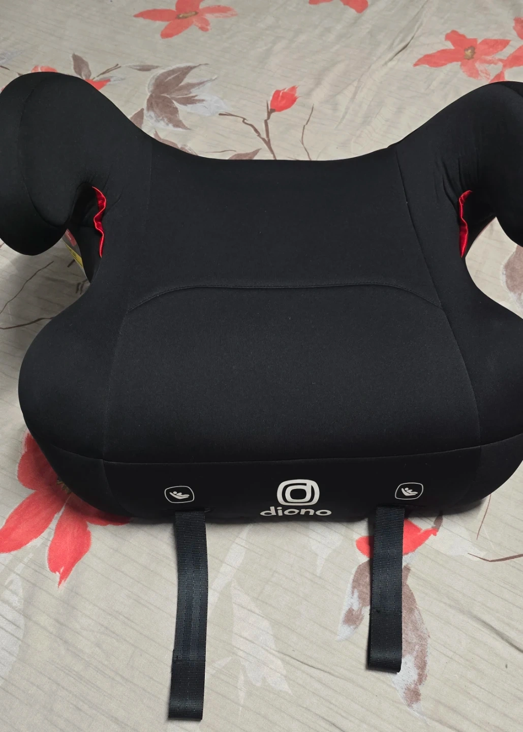 This is a Diono booster car seat in black. It's made of fabric and plastic. Designed for children 40-120 lbs. This was very rarely used like 10 times. It was wrapped and stored neatly. It was in a pet free home.
