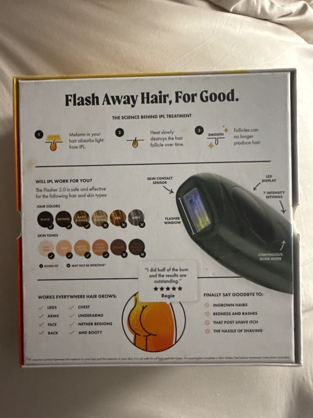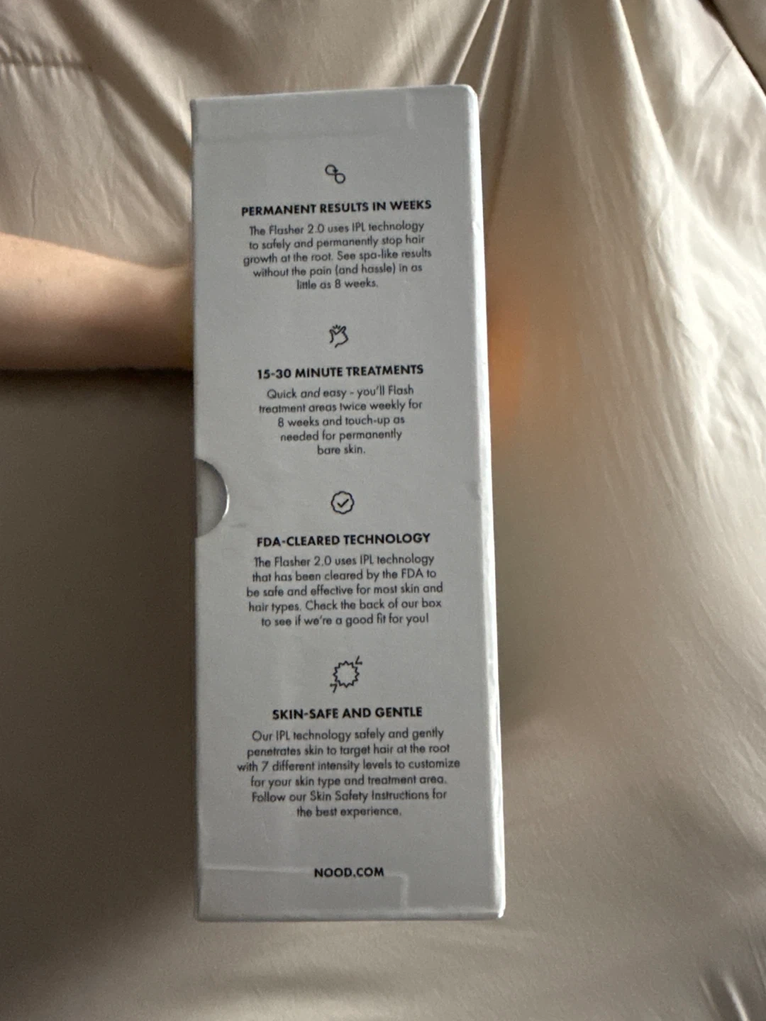 Permanently flash away hair with the Nood The Flasher 2.0 IPL device. This FDA-cleared device includes the IPL device, power cord, and instruction manual. It helps reduce hair in as little as 8 weeks!