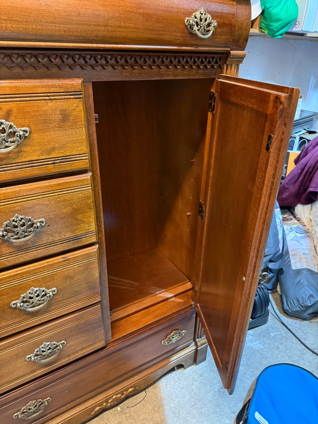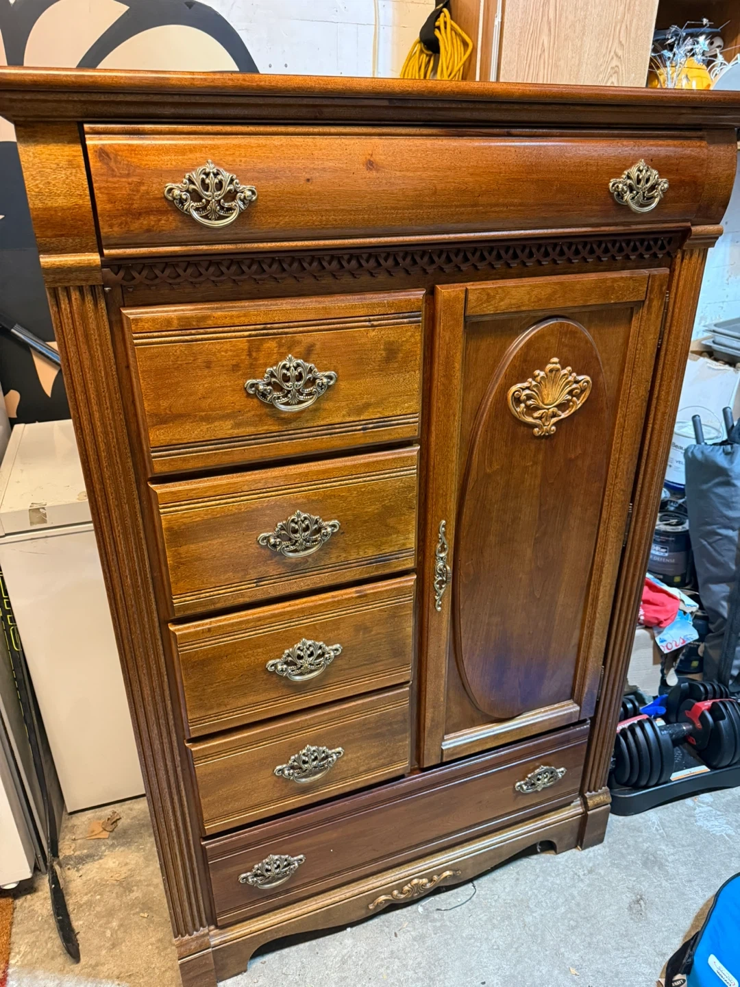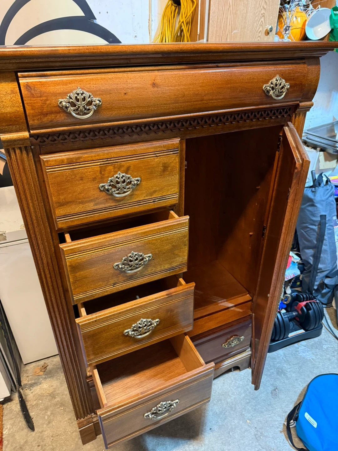 A beautiful wooden armoire with several drawers and a cabinet space. It's a classic piece with ornate hardware. Wood material construction. Measures approximately 72 inches tall, 30 inches wide, and 18 inches deep. Someone could use this for bedroom storage or in a hallway.