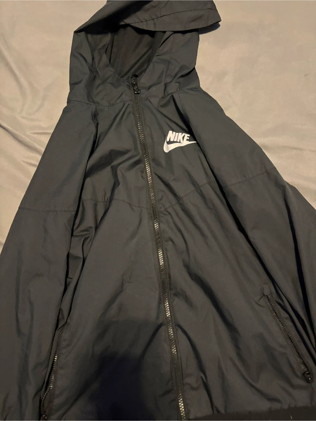 This is a Nike hooded windbreaker jacket in black. It features a full zip front and zippered pockets. It's a lightweight jacket, perfect for active wear.