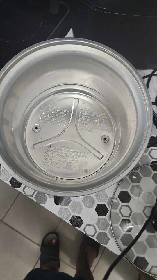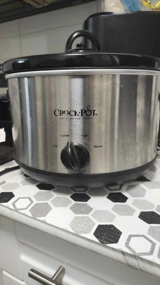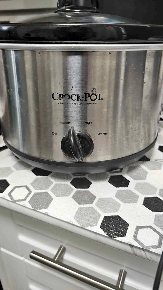 Handy Crock-Pot slow cooker. Stainless steel exterior with black interior pot and glass lid. Has settings for Off, Low, High, and Warm. Great for easy meals.