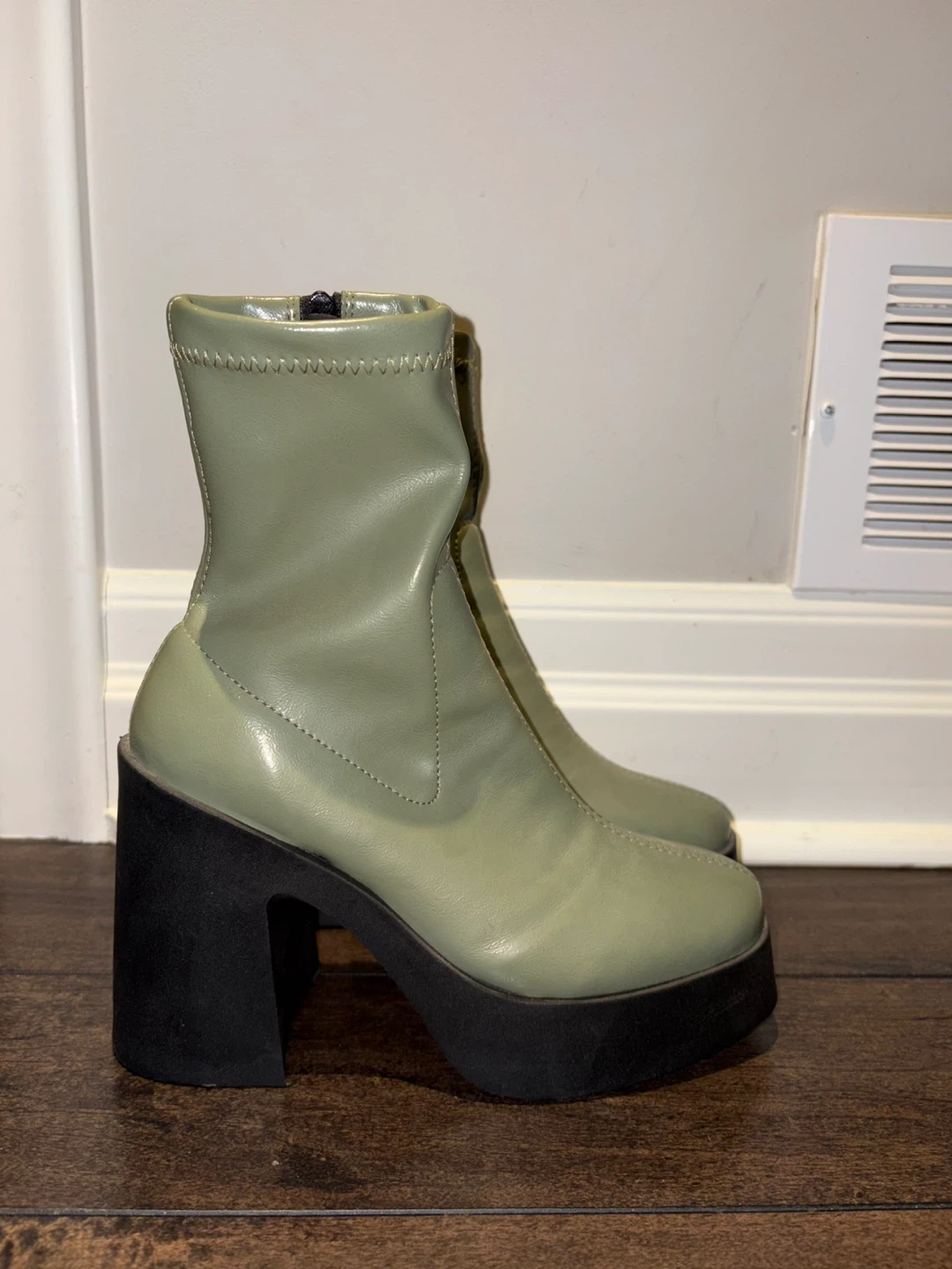 These light green ankle boots have a chunky black platform and heel. They're made with a stretchy upper and a zipper closure for easy on and off.