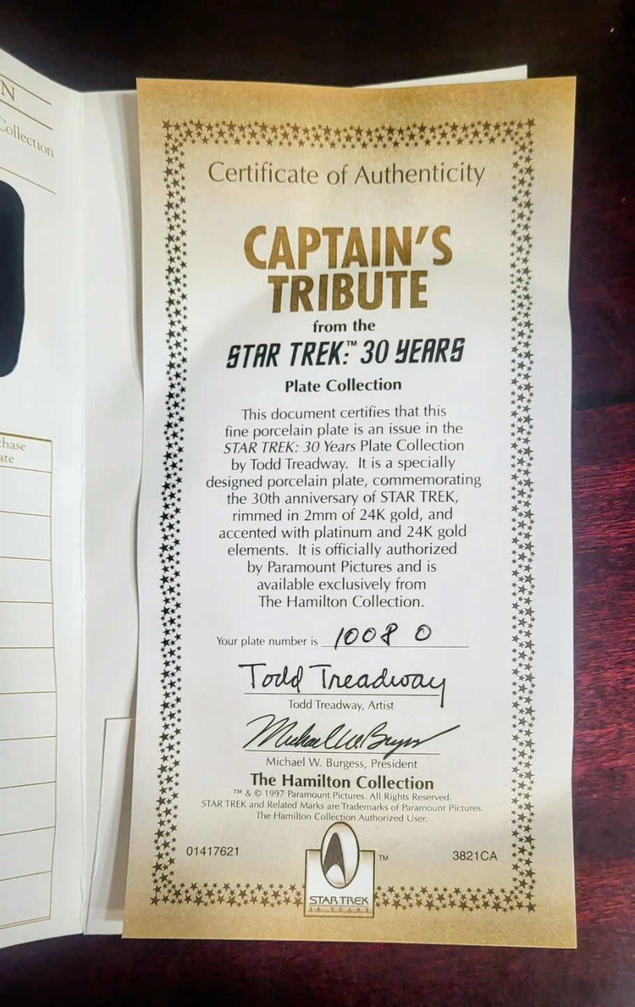 Made in 1997, this fine porcelain plate celebrates the 30th anniversary of Star Trek. It's rimmed in 2mm of 24K gold and accented with platinum and 24K gold elements. It is officially authorized by Paramount Pictures and is available exclusively from The Hamilton Collection