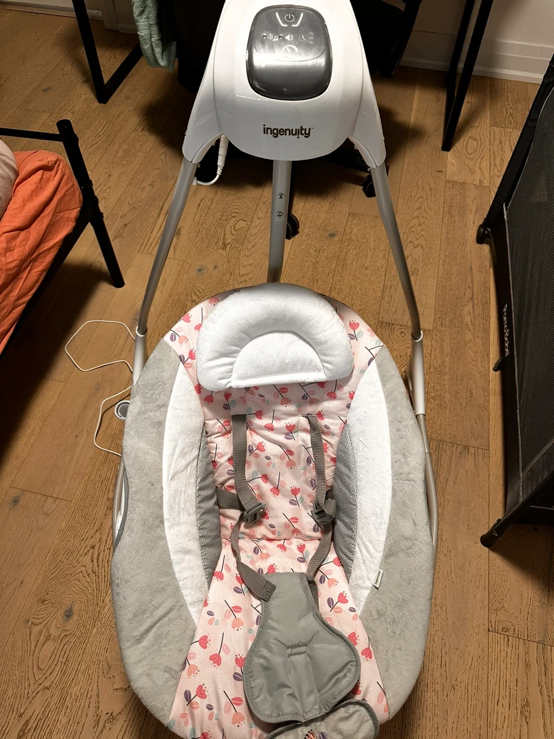 Selling a gently used Ingenuity baby swing. It features a cute floral design and is in great condition. It has different speed settings and a timer to help soothe your little one. Perfect for keeping baby happy and entertained! Never used.