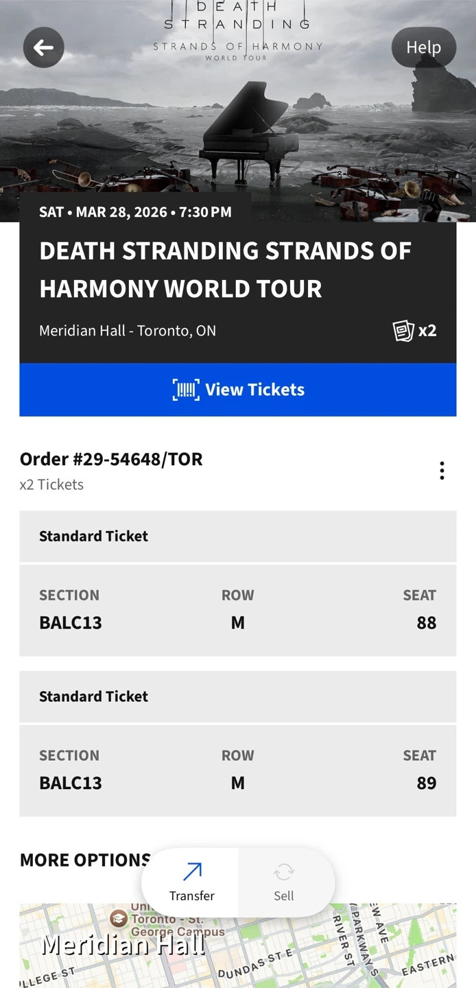 Two standard tickets for the Death Stranding Strands of Harmony World Tour. The event is on Saturday, March 28, 2026, at 7:30 PM at Meridian Hall in Toronto, ON. Section BALC13, Row M, Seats 88 and 89