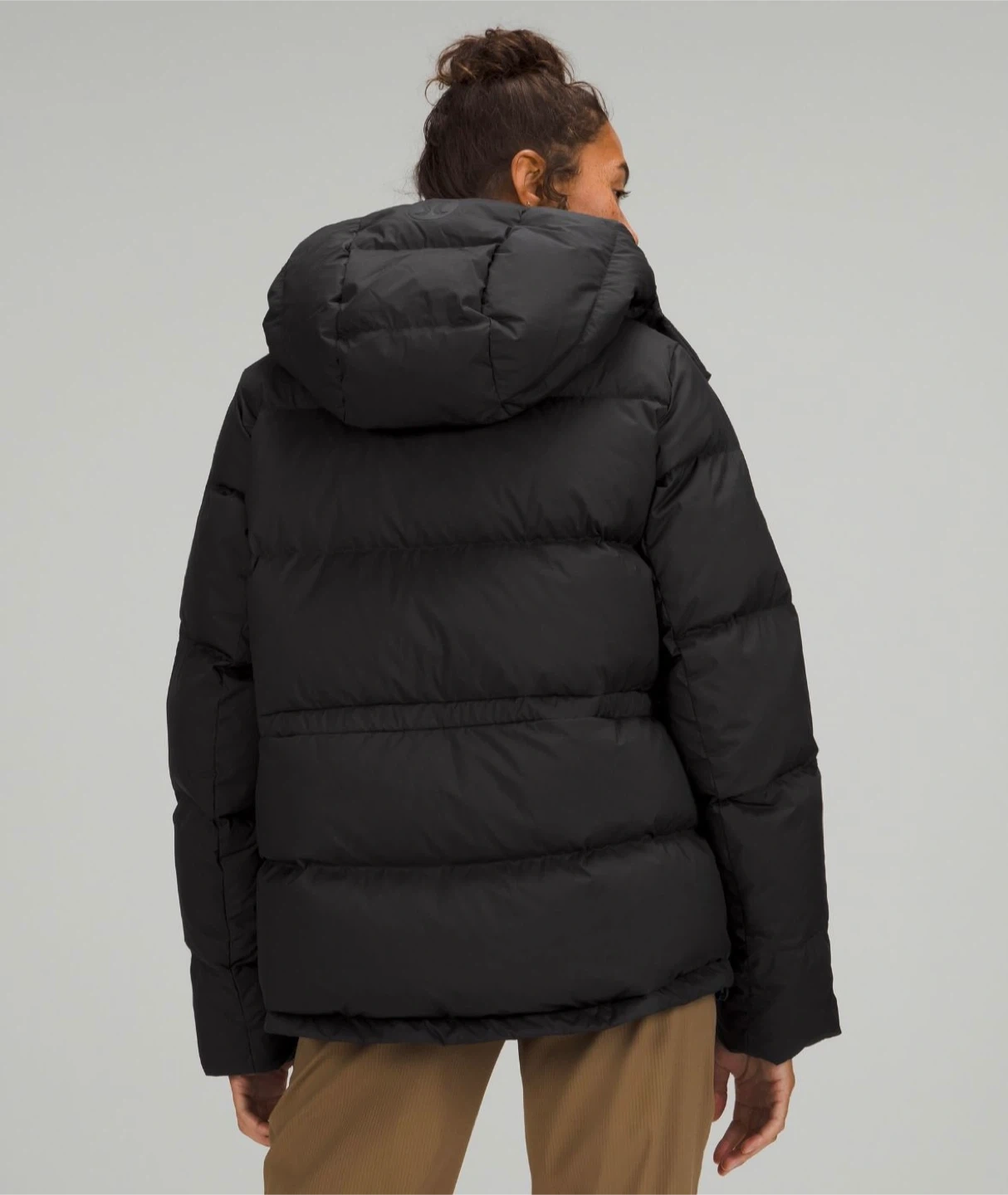 This black 600-Down-Fill Lululemon puffer jacket is warm and stylish. It has a hood and snap closures. It's made for keeping cozy during colder weather.