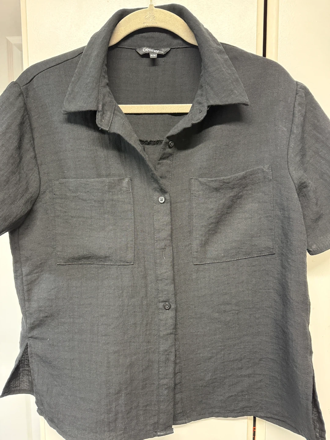 This George women's short sleeve shirt is black and size M/M. It's made with a textured fabric and features two chest pockets. The shirt has a collared neckline and button-up front. It's a casual piece great for everyday wear.