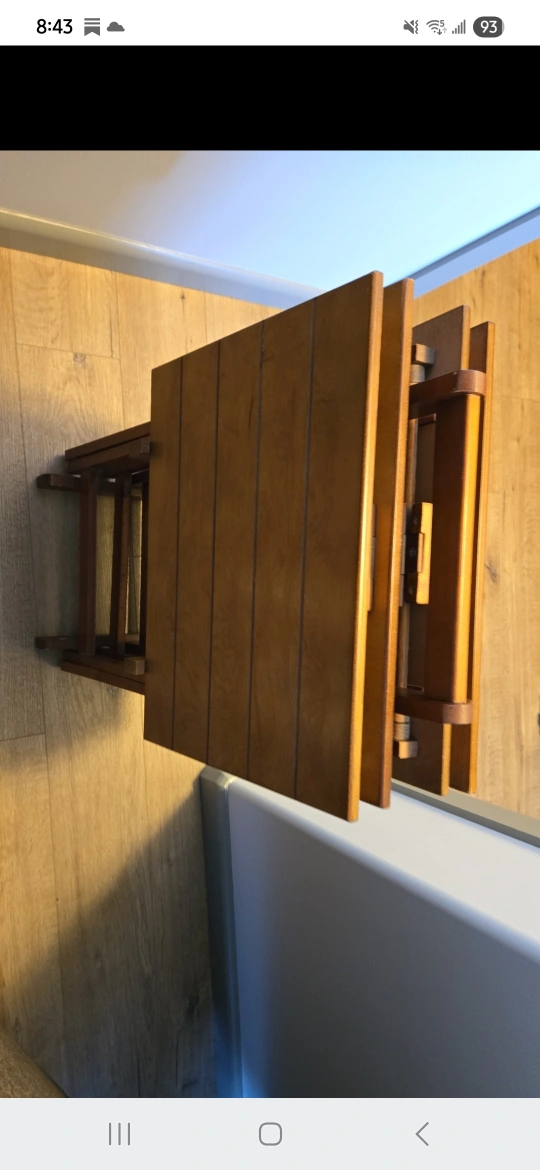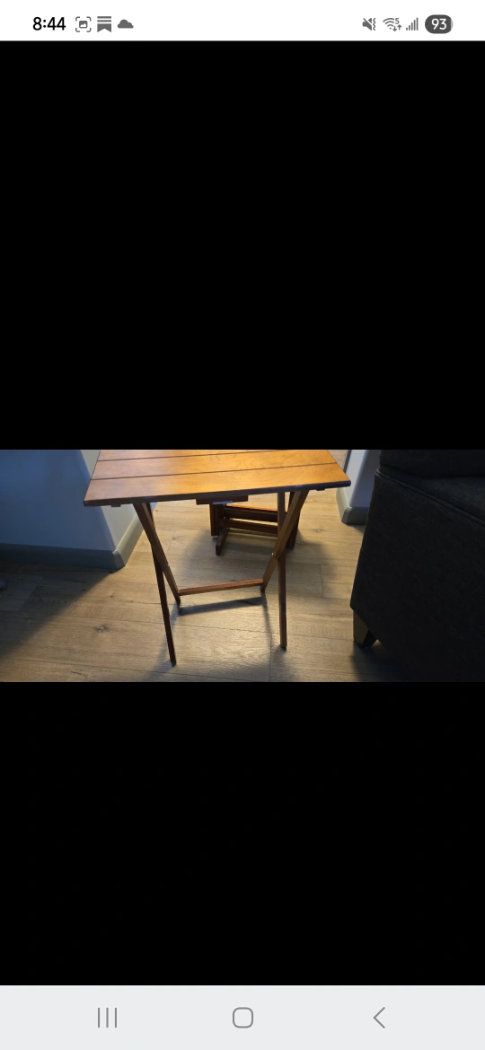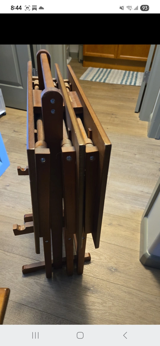 Selling a handy folding wooden TV tray set! It's great for small spaces or when you need an extra surface. It folds up neatly for easy storage when not in use. Perfect for a big gathering.
